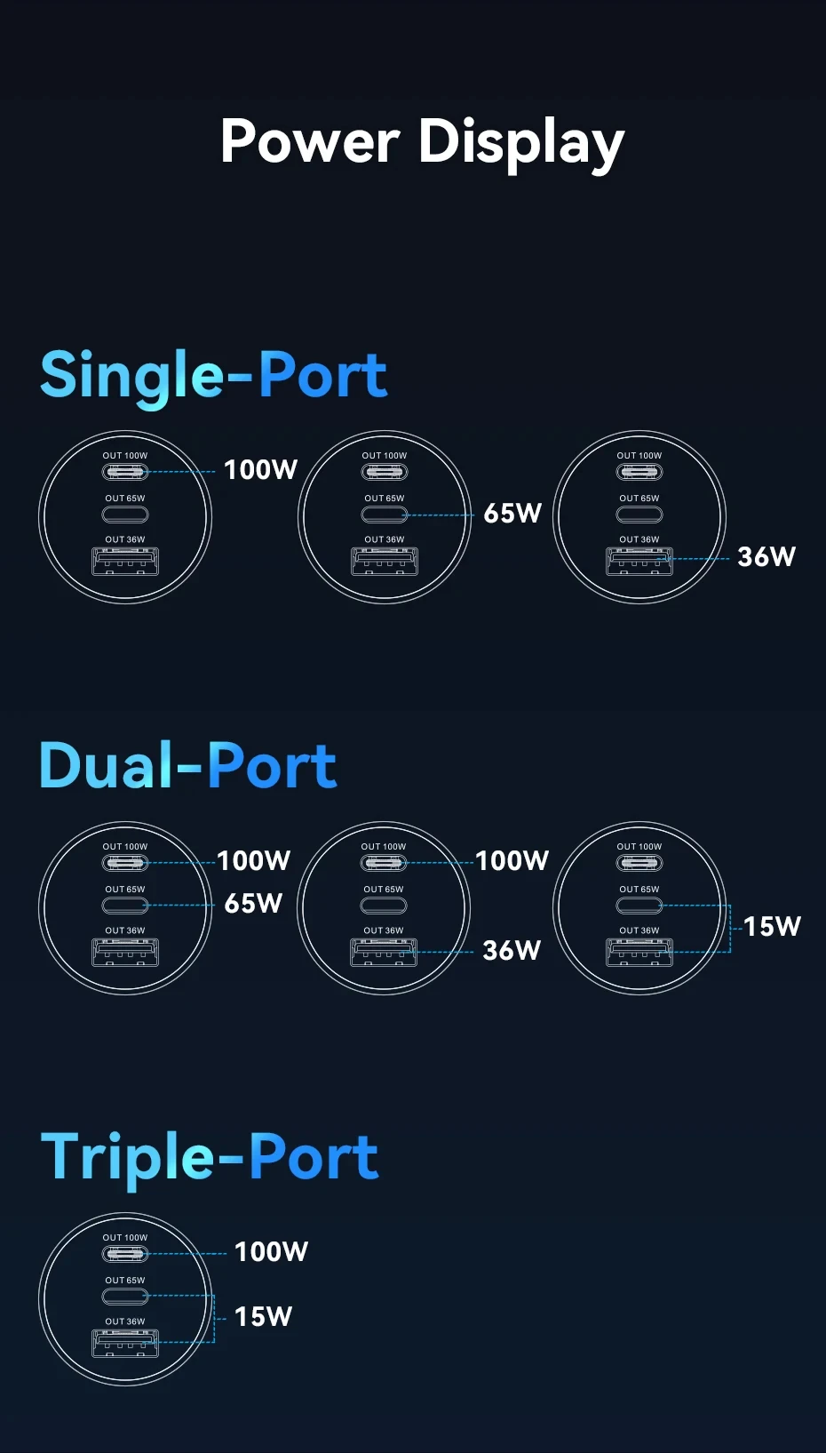 Salida (USB-C1 + USB-C2 + USB-A): 100W + 15W
