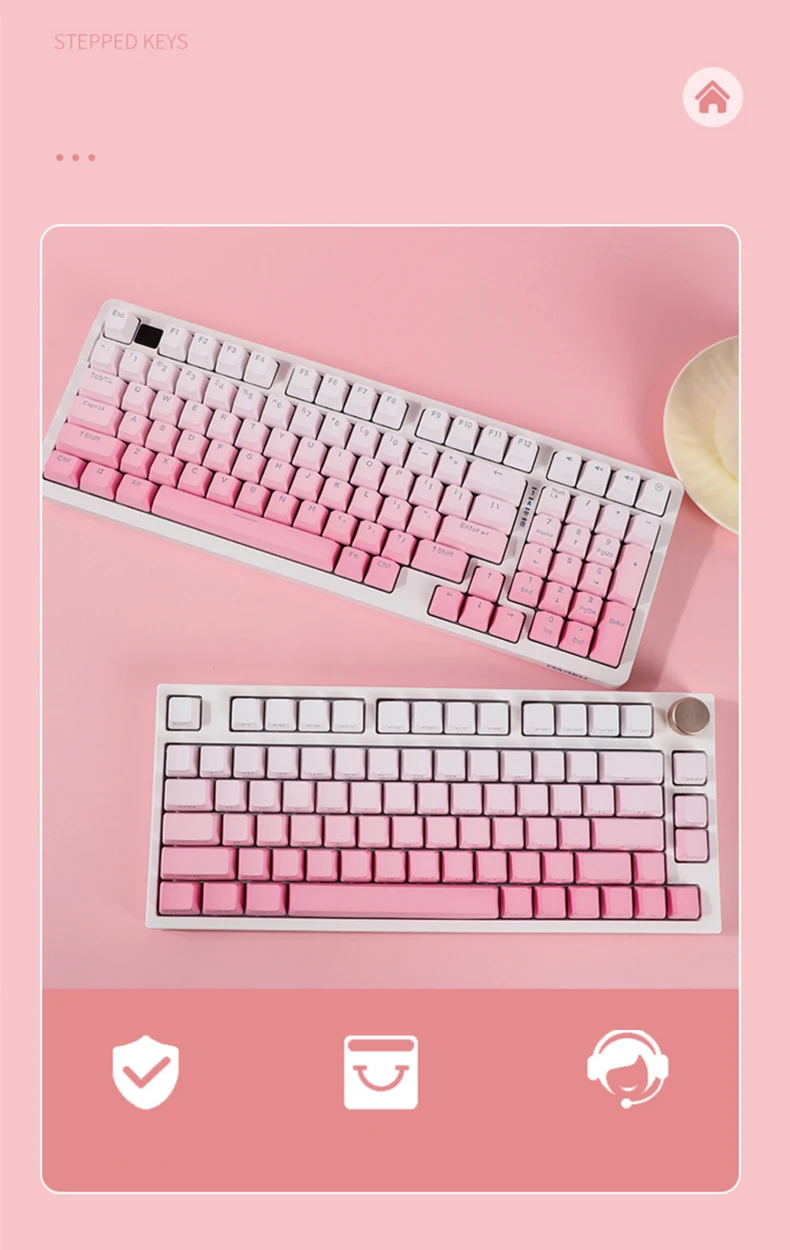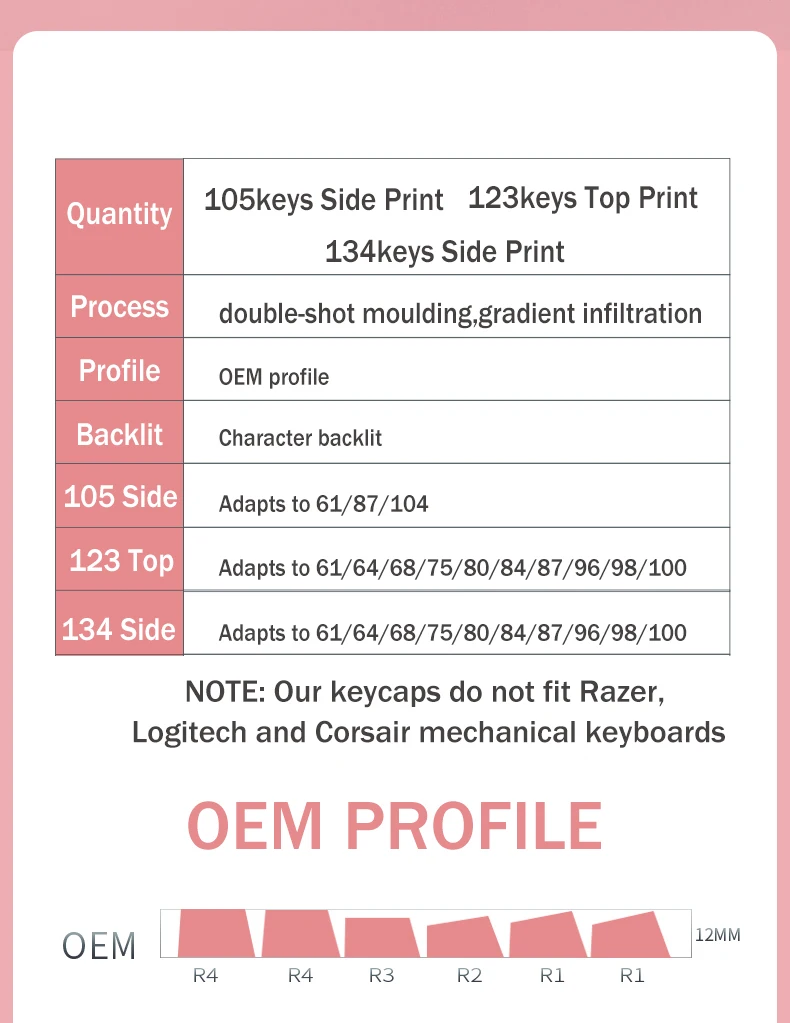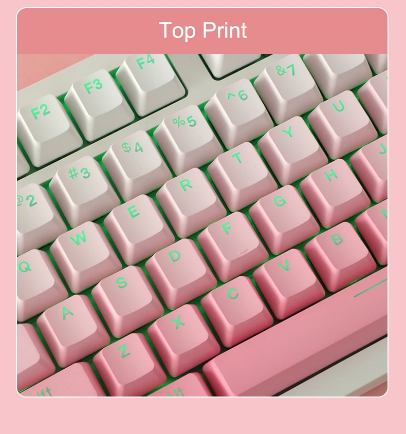 La versión de impresión lateral de 134 teclas incluye cambio 1.75U 2U, 1.5U Alt Ctrl, 6.25U 7U Barra espaciadora, es compatible con 61 、 64 、 68 、 71 、 75 、 84 、 87 、 96 、 980 、 teclado mecánico de diseño 104 、 108, etc. con interruptores MX