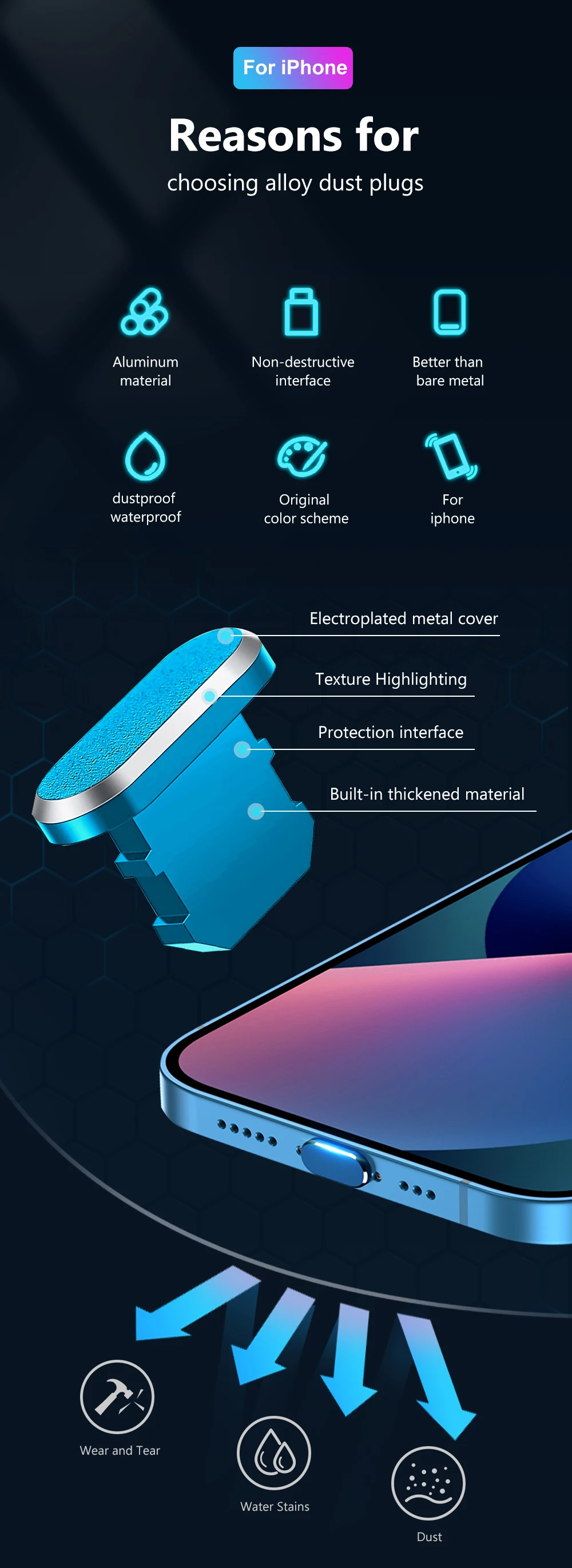 Comprar Tapón antipolvo para puerto de carga de iPhone, cubierta de aleación de aluminio para iPhone 11, 12, 13 Pro Max, X, XR, 8