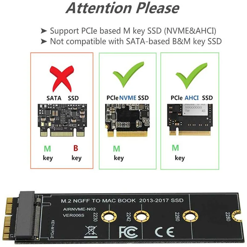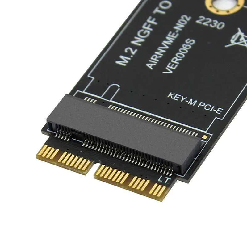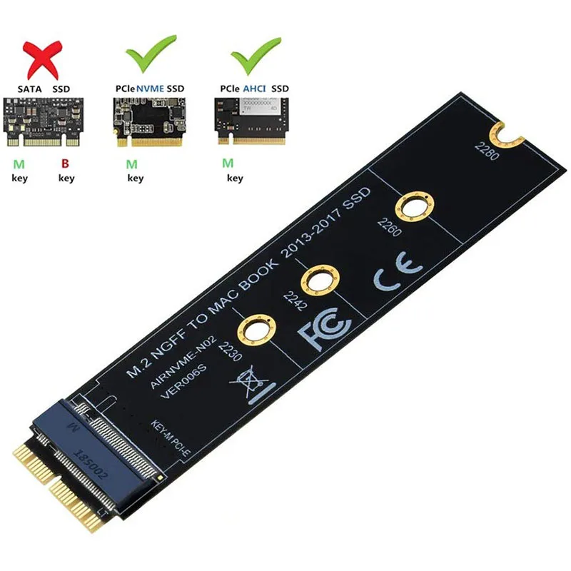 Tarjeta adaptadora de conversión SSD M.2 NVME para MacBook Air Pro Retina 2013-2017 A1465 A1466 A1398 A1502 NVME/AHCI SSD Kit actualizadoAcerca de la descripción:Características:Este adaptador de conversión SSD M.2 PCIe nVME permite actualizar SSD para MacBook 2013-2015 con SSD NVME de gran capacidad.Es compatible con MacBook Air 11” A1465 y MacBook Air 13” A1466 (mediados 2013-2017), MacBook Pro (Retina) 13" A1502 y 15" A1398 (fin de 2013 a mediados de 2015), Mac Pro ME253 MD878.Requiere macOS 10.13 High Sierra o posterior; NO es compatible con versiones anteriores a macOS 10.13.Utilice su SSD original para actualizar su macOS antes de la instalación.Admite SSD M.2 NVME/AHCI como Samsung 960 EVO, Samsung 970 EVO/PRO (no es compatible con 960 EVO Plus), WD Black, Crucial P1, HP EX920, ADATA SX8200, Intel 600p serie NVME SSD, etc.No admite la recuperación desde Internet, es importante preparar un controlador de disco USB inicializable (M.2 PCIe no tiene un sistema operativo interno, debe borrarse primero).Cómo utilizar:1.Asegúrese de instalar High Sierra en su unidad anterior, para que se instale un firmware más nuevo que pueda manejar NVME.2.Para su antiguo controlador, realice una copia de seguridad completa a través de Time Machine.3.Cree un instalador High Sierra en una memoria USB de arranque.4.Abra el macbook y desconecte la batería mientras apaga la unidad y asegúrese de que tanto el adaptador como el nuevo SSD estén bien ajustados.5.Vuelva a conectar la batería antes de cerrar la carcasa.6.Inserte la memoria USB del instalador del paso 2 y presione la tecla de opción mientras se inicia la máquina.7.Finalmente, una vez que esté listo, ahora puedes ir a los útiles del disco para formatear e instalar el MAC OS.Aviso:1.Le recordamos que macOS falló en reanudar al hibernar con algunos SSD NVME de algunas marcas.Tienes que apagar la computadora portátil todo el tiempo en lugar de cerrar la tapa y listo.2.Inserte nuestro adaptador completamente en la ranura SSD y primero debe preparar un disco USB de arranque (consulte el tercer punto) con High Sierra para formatear el SSD M.2, no admite la recuperación desde Internet.3.Hay muchos clientes que pueden usarlo, por lo que le sugerimos que lo vuelva a intentarlo si su MAC no puede detectar nVME SSD.Recibirás:1 tarjeta adaptadora.1 x juego de tornillos y controlador