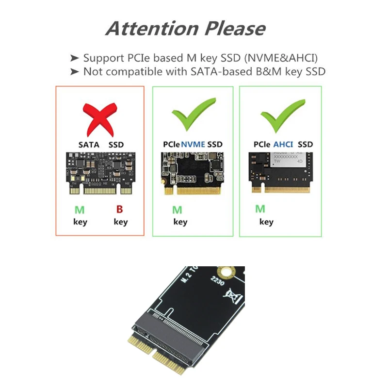 Esta tarjeta adaptadora admite 2280 PCIE X4 y PCIE X2 protocolo M.2 NGFF SSD unidades de estado sólido para convertirse en 2013 2014 2015 versión Apple MacBook AIR y PRO A1465 A1466 A1502 A1398. PCIE X4 M.2 NGFF SSD se divide en el Protocolo AHCI y el Protocolo NVMe. Los compradores de nivel principiante utilizan discos duros de protocolo PCIe x2 o X4 AHCI. Los compradores con una gran experiencia práctica pueden usar el protocolo NVME PCIe X4 M.2 NGFF. Instalación SSD. Con respecto a si usar el disco duro de protocolo AHCI o el disco duro de protocolo NVME, este es su propio problema técnico y no tiene nada que ver con la tarjeta adaptadora. ¡Los compradores novatos recomiendan Comprar PCIe X4 M.2 NGFF AHCI SSD para usar esta tarjeta adaptadora!
