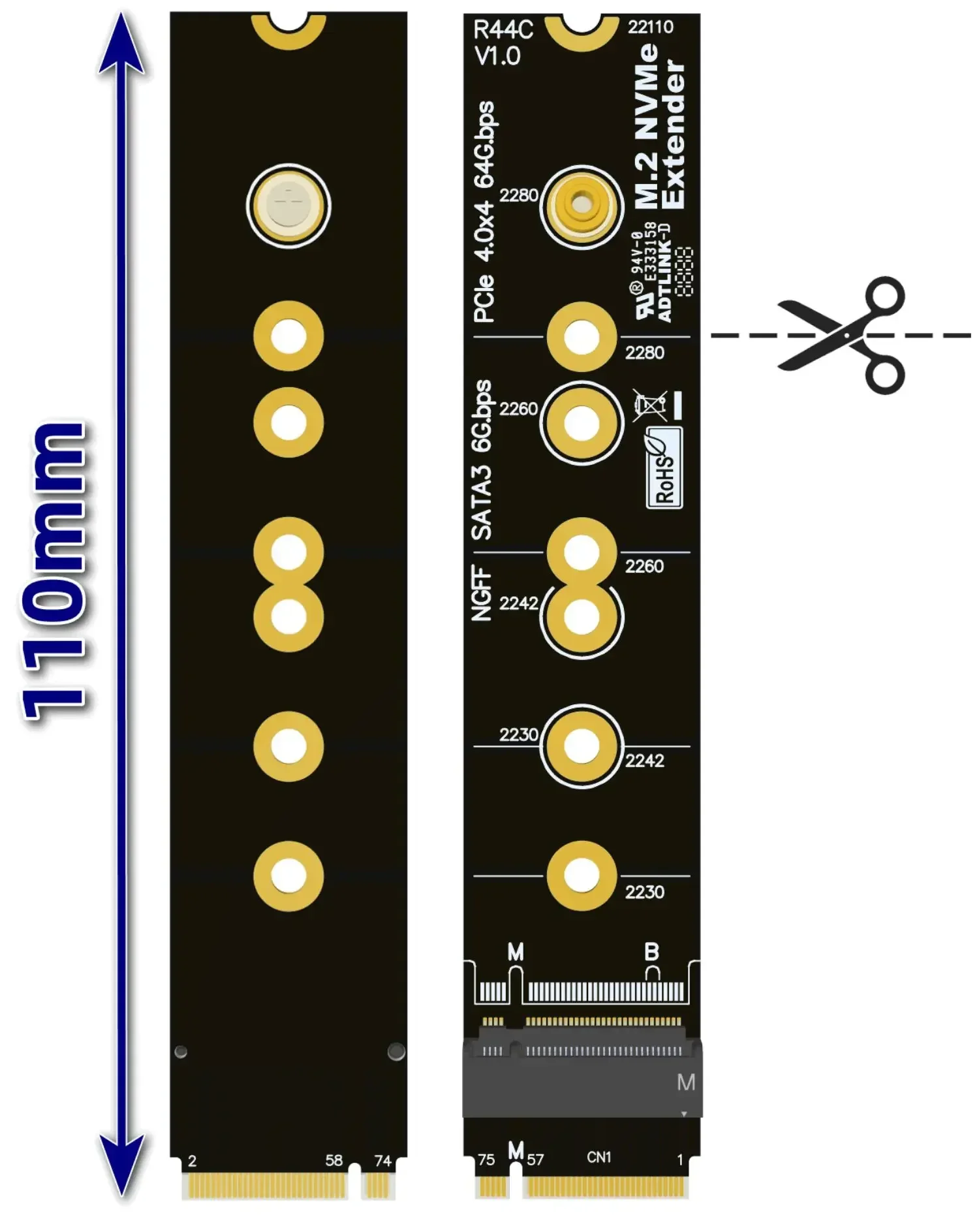 La placa adaptadora mide 110 mm de largo y 22 mm de ancho, y se puede cortar a lo largo de la línea blanca según su computadora portátil.