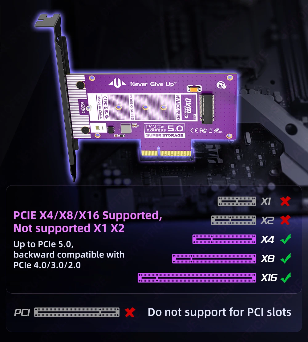 El adaptador JEYI PCIe 5.0 NVMe está optimizado específicamente para unidades de estado sólido NVMe M.2 y no puede acomodar dispositivos de almacenamiento M.2 SATA o NGFF (protocolo SATA).