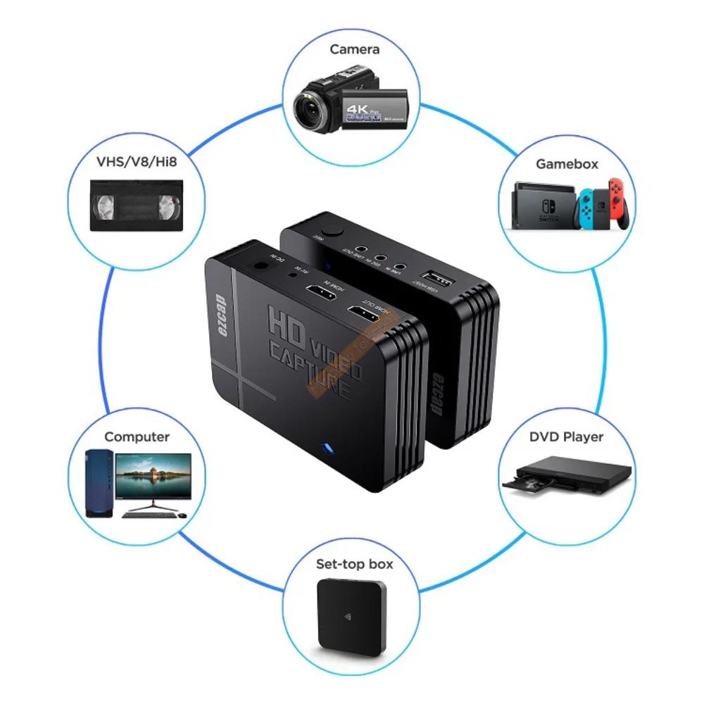collects various videos from DVD/Camera/HD player/set-top box/computer/XBOX/PS3/PS3 game console, etc, stored in a U disk or mobile hard disk plugged into ezcap280. No computer required, one-click recording.