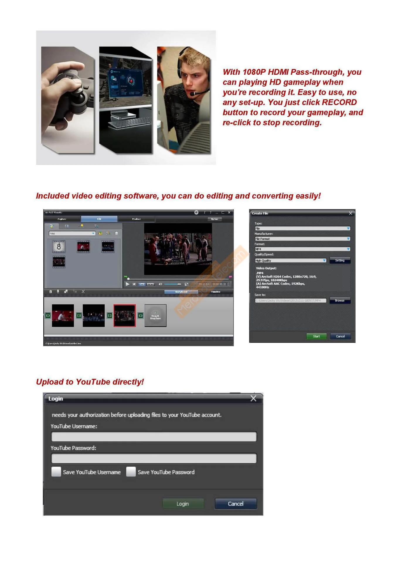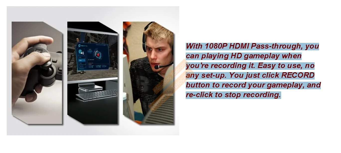 With 1080P HDMI Pass-through, youcan playing HD gameplay whenyou're recording it. Easy to use, noany set-up. You just click RECORDbutton to record your gameplay,andre-click to stop recording.