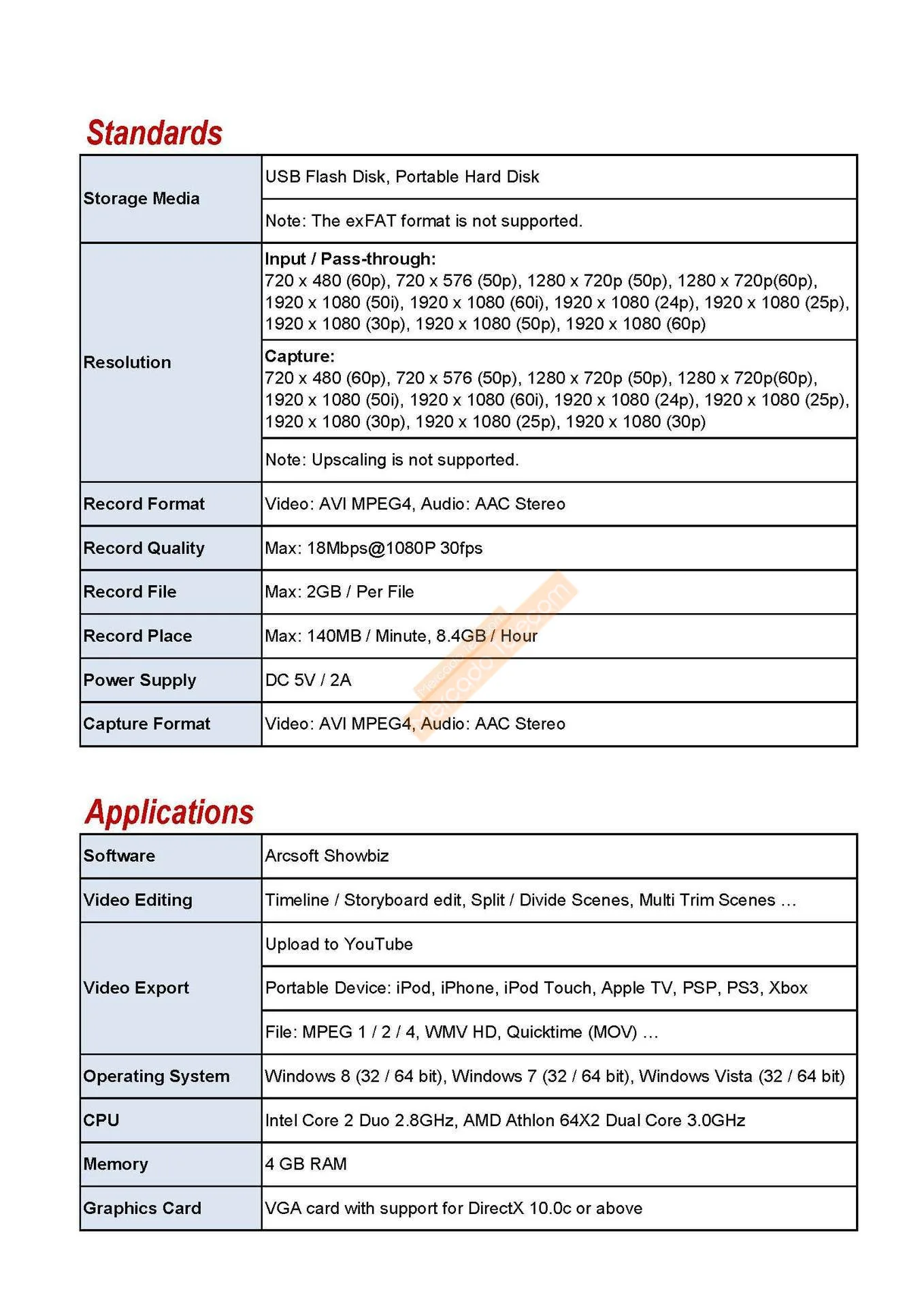 - Storage Media: USB Flash Disk, Portable Hard Disk (exFAT format is not supported)