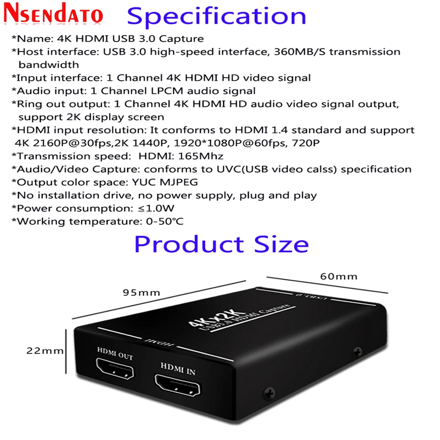 ComentariosMuchas gracias por comprar Nsendato 4K HDMI USB3.0 Capture desarrollado y configurar este producto. Esperamos que este producto pueda ofrecerle un maravilloso y producido por nuestra empresa. Los siguientes detalles explican cómo usarlo usando la caja de colección de juegos 4K HDMI USB30 hd, solo necesita conectarse a su computadora (soporte del sistema Windows, MAC, Linux),no es necesario instalar el controlador, y luego utilizar software de terceros para recoger el vídeo del juego orstream hd u otra fuente de vídeo hd.Característica1. Interfaz del Host: Interfaz de alta velocidad USB30, ancho de banda de transmisión 360 MB/S2. Interfaz de entrada: 1 canal 4K HDMI hd video signaAudio entrada: 1 canal LPCM señal de audio3. Salida anular: 1 canal 4K HDMI hd salida de señal de audio y video, admite pantalla de visualización 2K4. La resolución de entrada HDMI se ajusta al estándar H DMI1 4 y admite 4K 2160P 30FPS, 2K 1440P 1920*1080p 60fps, 720p.5. Velocidad de transmisión: HDMI 165Mhz6. Captura de vídeo: se ajusta a UVC (clase de vídeo USB).7. Captura de Audio: se ajusta a UVC (clase de vídeo USB).8. Espacio de color de salida: YUC MJPEG9. Compatible con Windows 10/Windows 8,1/Windows 7(X86, X64)OS X (10,10 orLinux Ubuntu 14,04 o superior).Paquete1 * captura usb3.0 4k HDMI1 * cable de alimentación USB1 * cable usb3.01 * manual