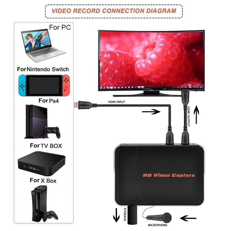 Comprar Tarjeta de captura de Audio y vídeo de 1080P, micrófono de entrada, TV Loop, caja de grabación HDMI para PS4, XBOX, juego, cámara HD a disco Flash USB U