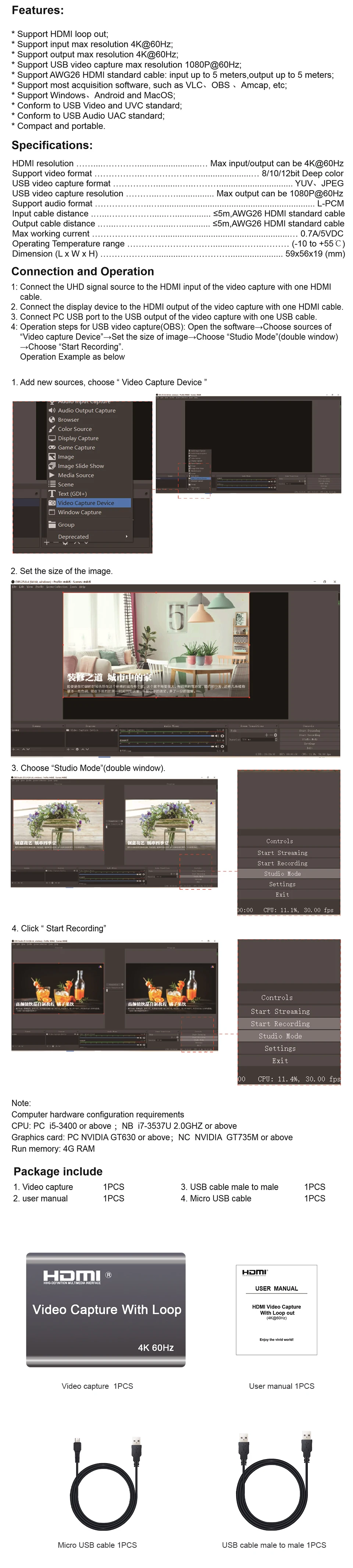 4K 60Hz USB HDMI Video Capture Card TV Loop 1080P Game Recording Plate Live Streaming Box USB 2.0 Grabber for PS3 PS4 Camera