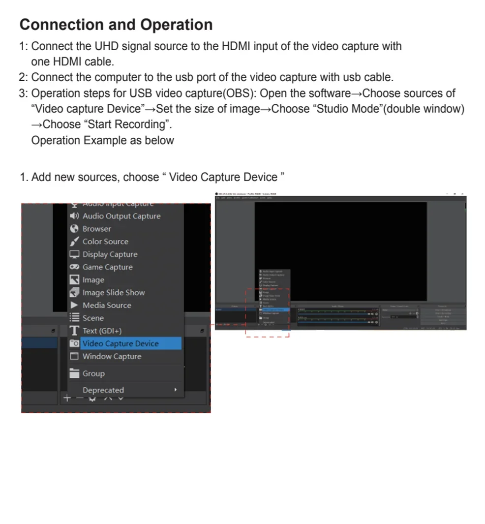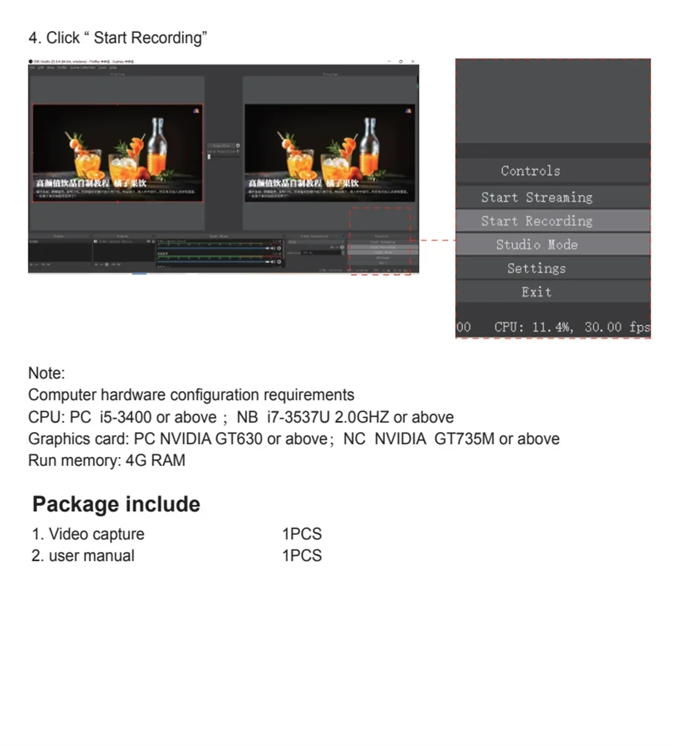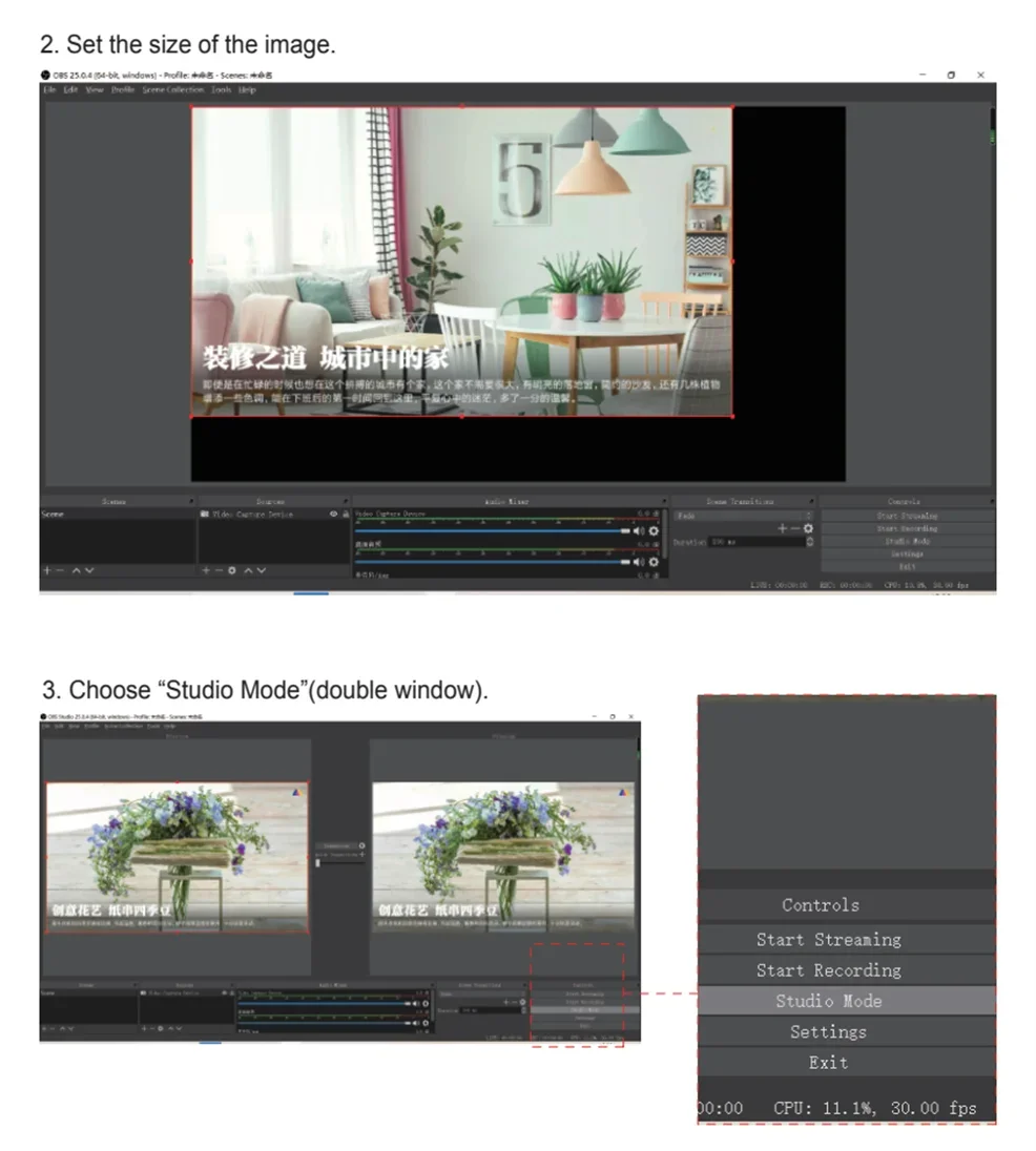 3: Pasos de operación de colección (OBS): Abra el software-Agregue una nueva fuente-seleccione "dispositivo de captura de video"-Configure el tamaño de la pantalla-Seleccione "Modo de estudio" (doble ventana)-Haga clic en "Iniciar grabación"