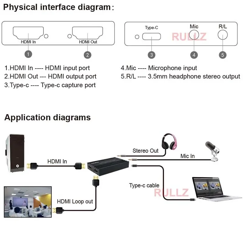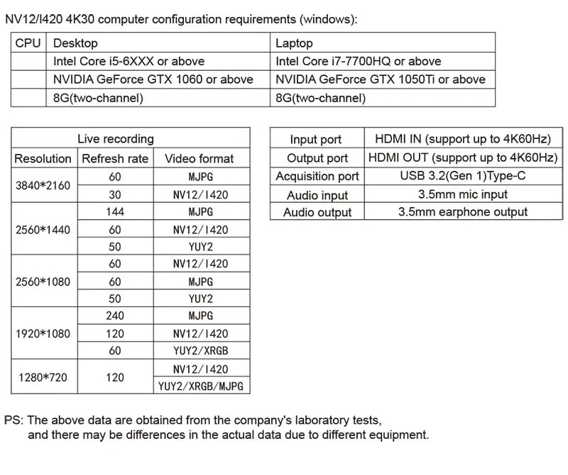 Admite HDCP2.2/HDCP1.4/HDR10. Entrada: entrada HDMI2.0 de 4k, entrada de micrófono. Salida: salida de bucle HDMI 2.0 de 4k, salida tipo c (5 Gbps), salida de audio. Detección automática de señales de entrada, resolución de hasta 4K@60Hz. Formato de vídeo compatible: MJPEG/YUY2/NV12/I420, etc. Adquisición de audio y vídeo sin comprimir, cumple con los estándares UVC y UAC. Fuente de alimentación USB tipo c, plug and play, sin unidad. Compatible con Windows, MacOS. Compatible con OBS, Potplayer, VLC, Vmix, etc.