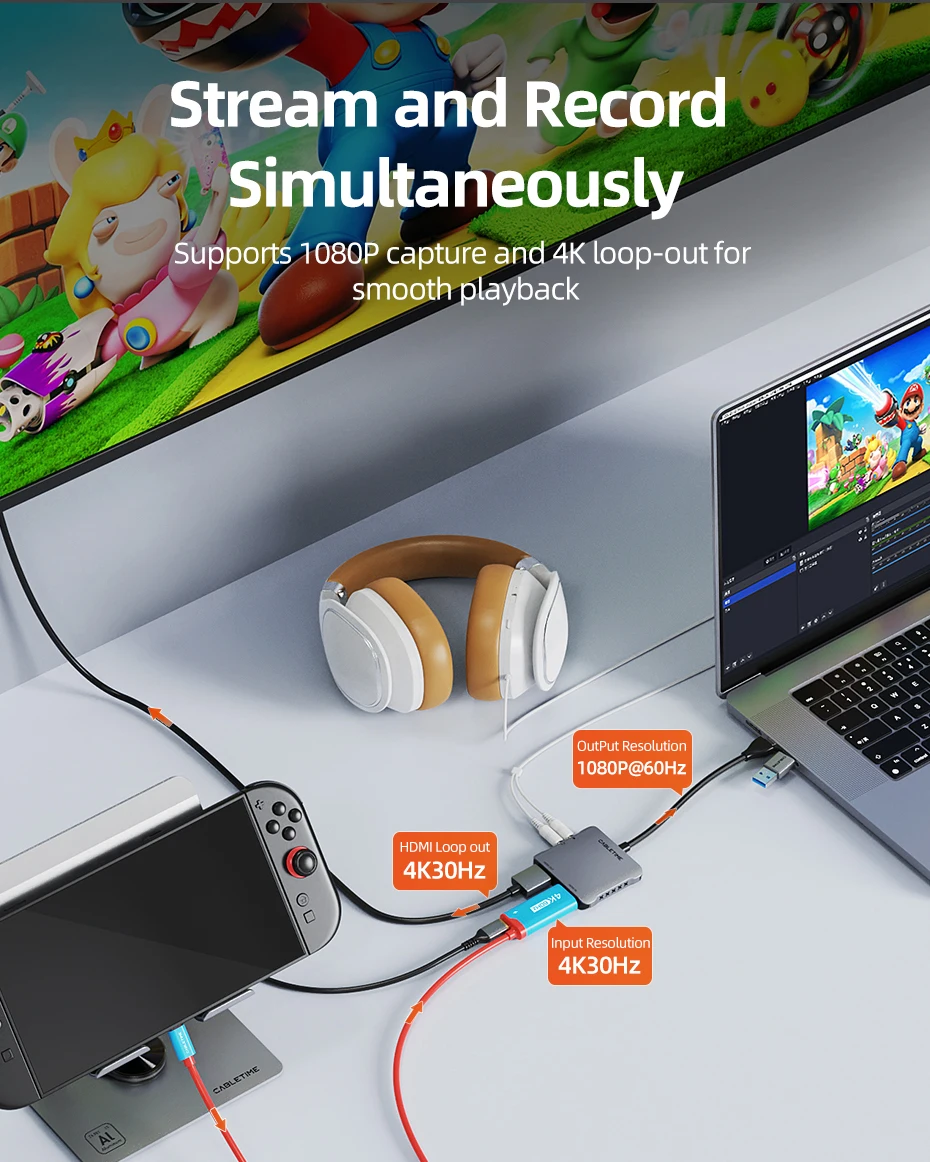 La tarjeta de captura de video CABLETIME HDMI a USB 3.0 admite entrada 4K@30Hz y bucle out 4K@30Hz, lo que le permite disfrutar de un juego o presentaciones ininterrumpidas mientras graba en [email protected] visualización en tiempo real en una pantalla externa sin demoras, lo que la hace ideal para jugadores, educadores y transmisores que necesitan retroalimentación instantánea mientras transmite.