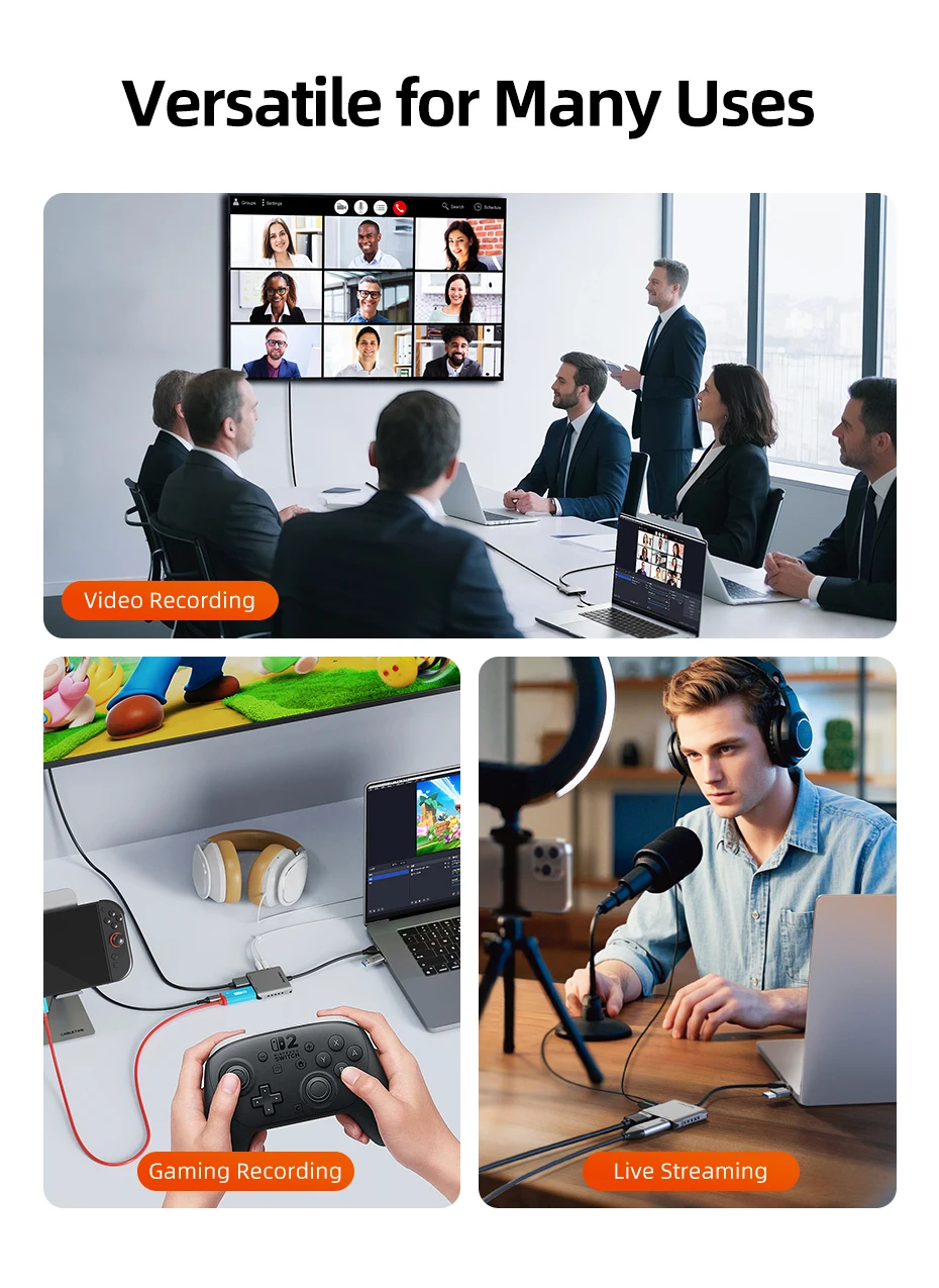 Esta tarjeta de captura USB-A/C a HDMI funciona perfectamente con una amplia gama de dispositivos, incluidos computadoras portátiles, de escritorio, iPads, Switch, PS5, teléfonos, cámaras, proyectores, drones y cajas de TV. Con entrada/salida HDMI más puertos de micrófono y auriculares, es la solución todo en uno perfecta para juegos, streaming, enseñanza en línea y presentaciones profesionales.