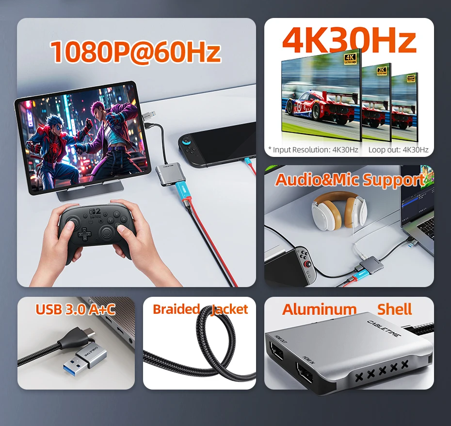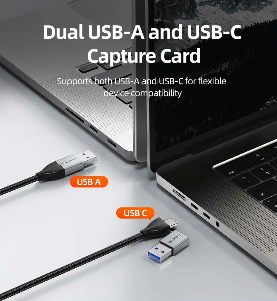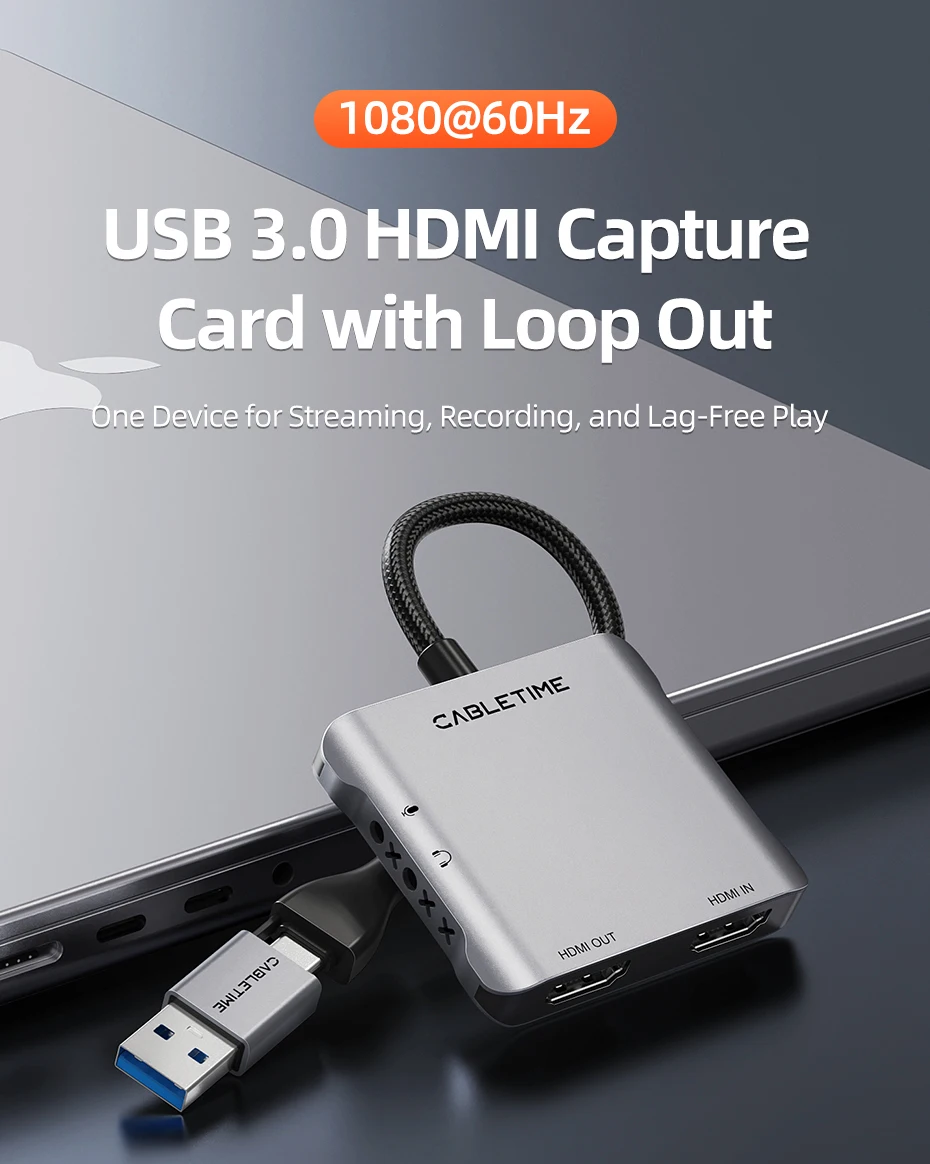 La tarjeta de captura de video CABLETIME USB A y USB C incluye salidas USB-A y USB-C, lo que ofrece compatibilidad perfecta con computadoras portátiles, de escritorio, MacBook y tabletas.No se necesitan adaptadores: simplemente conéctelo para transmitir, jugar o grabar fácilmente.Con USB 3.0 de alta velocidad, ofrece una grabación fluida de 1080P a 60 Hz y una transmisión estable en todas las plataformas principales.