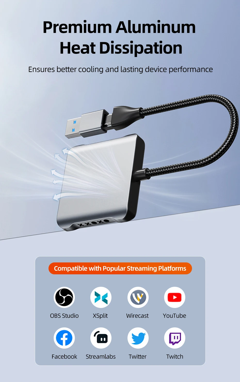 Fabricada con una carcasa de aluminio de primera calidad, esta tarjeta de captura proporciona una excelente disipación de calor para evitar el sobrecalentamiento durante el uso prolongado.El diseño resistente no solo garantiza una mejor refrigeración sino que también mejora la durabilidad, brindando un rendimiento confiable para largas sesiones de transmisión, juegos o grabación.