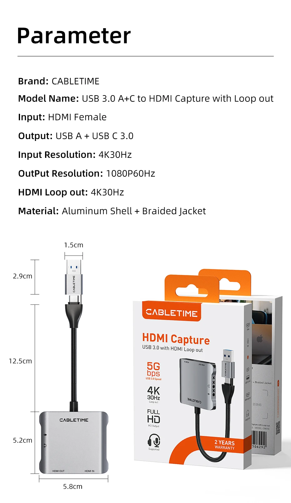 Comprar Tarjeta de captura de vídeo CABLETIME USB 3,0 a captura HDMI con salida de bucle 4K @ 30Hz para USB/tipo-c Gaming PS5 Switch transmisión de vídeo