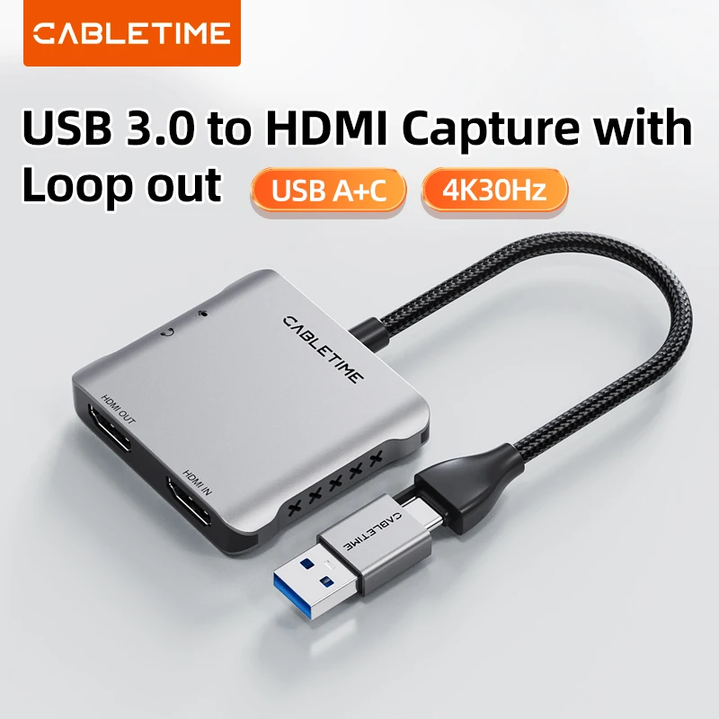Comprar Tarjeta de captura de vídeo CABLETIME USB 3,0 a captura HDMI con salida de bucle 4K @ 30Hz para USB/tipo-c Gaming PS5 Switch transmisión de vídeo