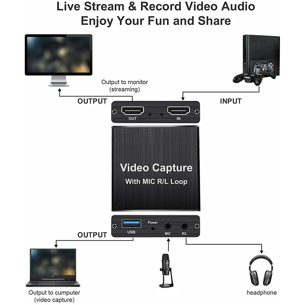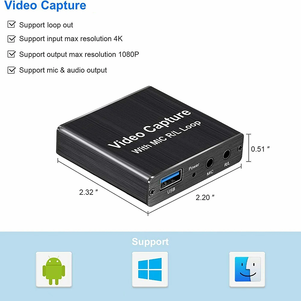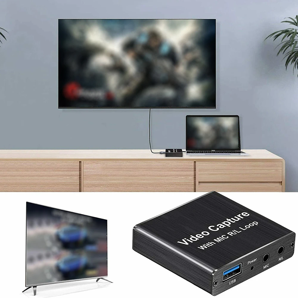 Comprar Tarjeta de captura de vídeo Compatible con HDMI 4K, dispositivo grabador USB 2,0, tarjeta de captura de juegos para transmisión en vivo, grabación de vídeo, salida en bucle
