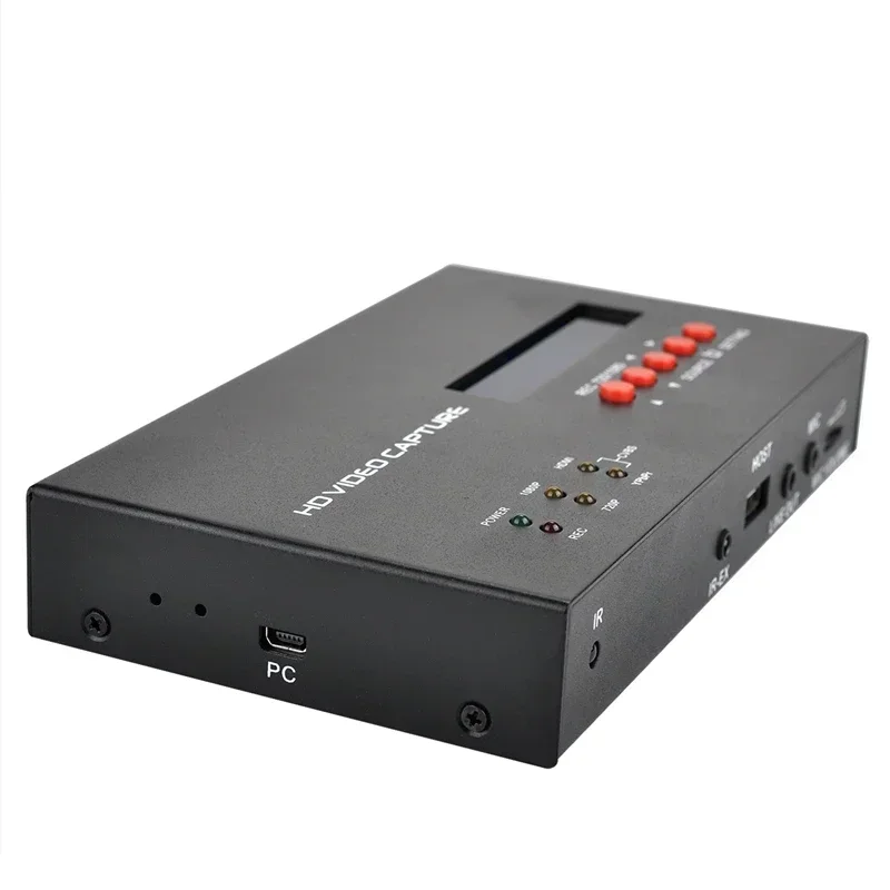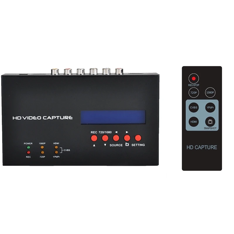 •Nuevo y de alta calidad, oferta directa de fábrica, ¡compre con confianza!Grabación 1080P con un solo clic, no se requiere PC•HDMI, Ypbpr (componente), entrada AV•Con entrada de micrófono•Con control remoto, puede cambiar la fuente de video, grabar/detener•Más opciones de entrada de vídeo: HDMI, vídeo componente, vídeo compuesto.Con paso HDMI.•con la función de registro programado, puede establecer una hora específica en un día o todos los días para grabar.•Es NUEVO diseñado con una pantalla LCD para mostrar la hora actual y el estado del horario, muy conveniente.•También con MIC in, puede grabar voz con el video juntos; con el botón de ajuste de volumen, puede cambiar el volumen de entrada de su micrófono.•Botón de grabación, botón de interruptor 720p/1080p, botón de cambio de fuente.•Simplemente inserte un disco flash USB para conseguirlo en cualquier lugar y en cualquier momento.•Recuperador de infrarrojos y puerto de expansión de 3,5 mm para control remoto•Medios de almacenamiento: disco flash USB 2.0 o 3,0 U o disco duro portátil (no es compatible Formato EXFAT. )