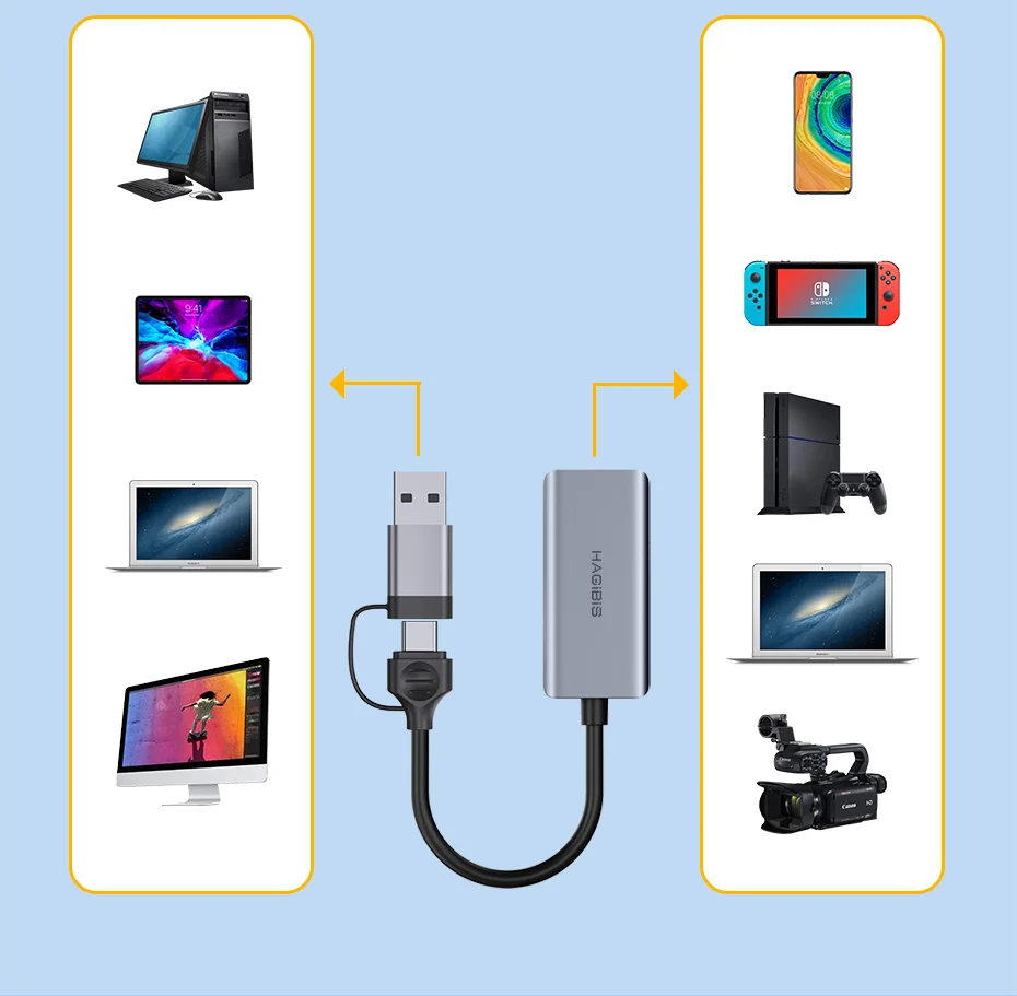 【Vero grabación de vídeo USB3.0 1080P 60Hz】:Las tarjetas de captura de video Hagibis tienen una entrada de alta definición de hasta 4K@60Hz y una resolución máxima de salida de 1920×[email protected] grabación de alta calidad de 1080P 60 fps y vaporización en vivo. La tarjeta de captura de audio y vídeo es muy adecuada para juegos en vivo, grabación, edición y transferencia de juegos en alta resolución de 1080p a 60 fps en OBS, AMCap, Xsplit, VCL y más.