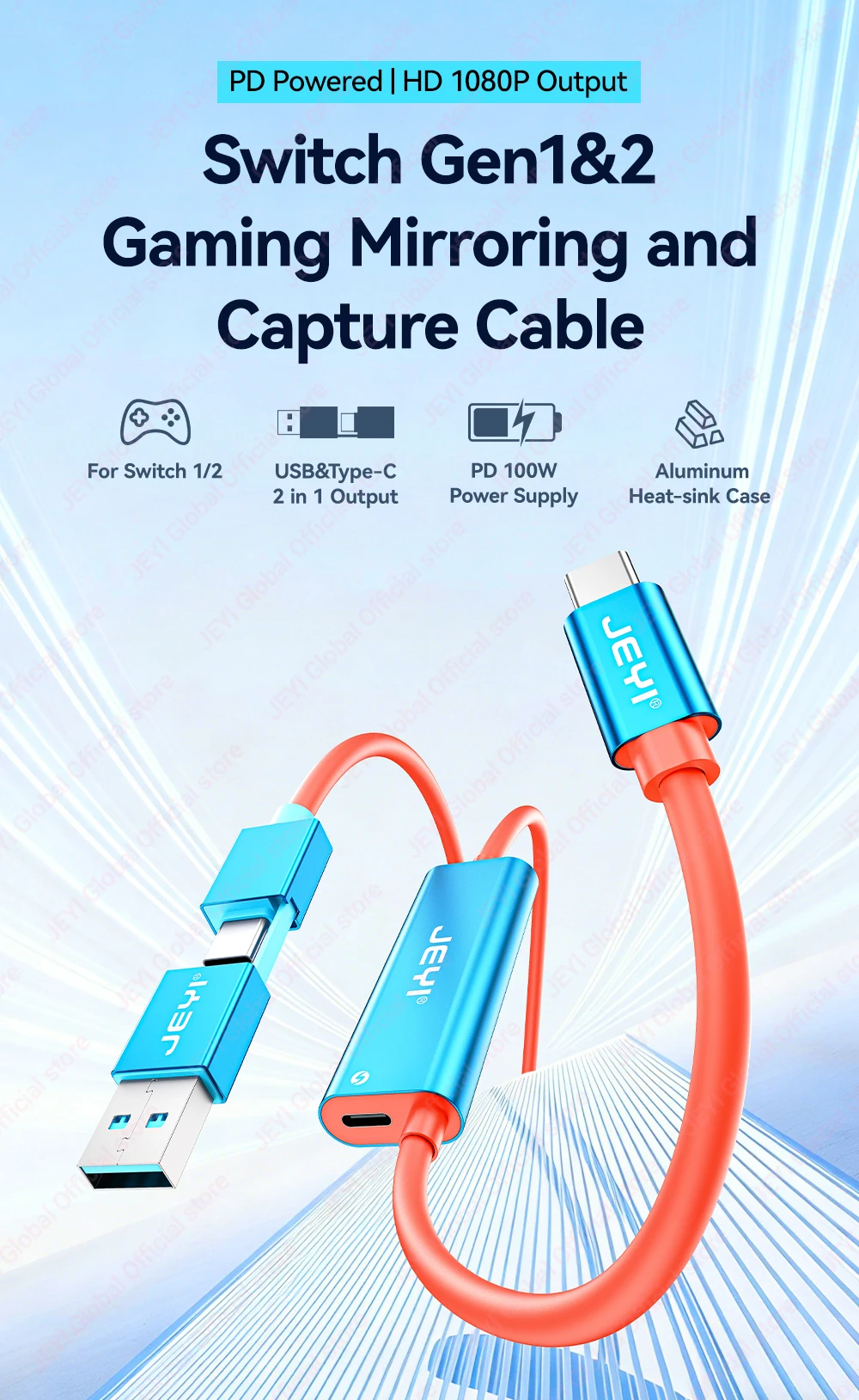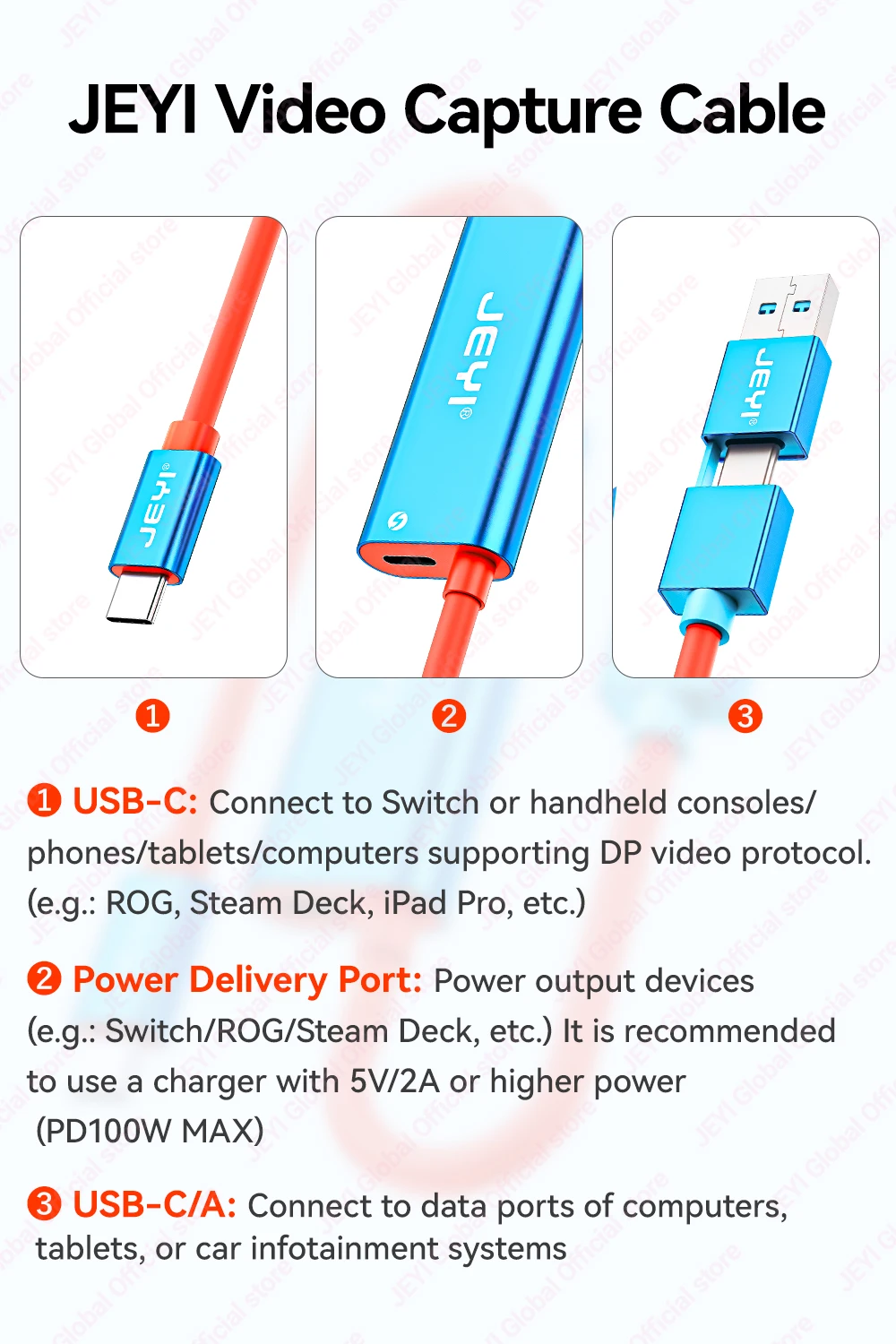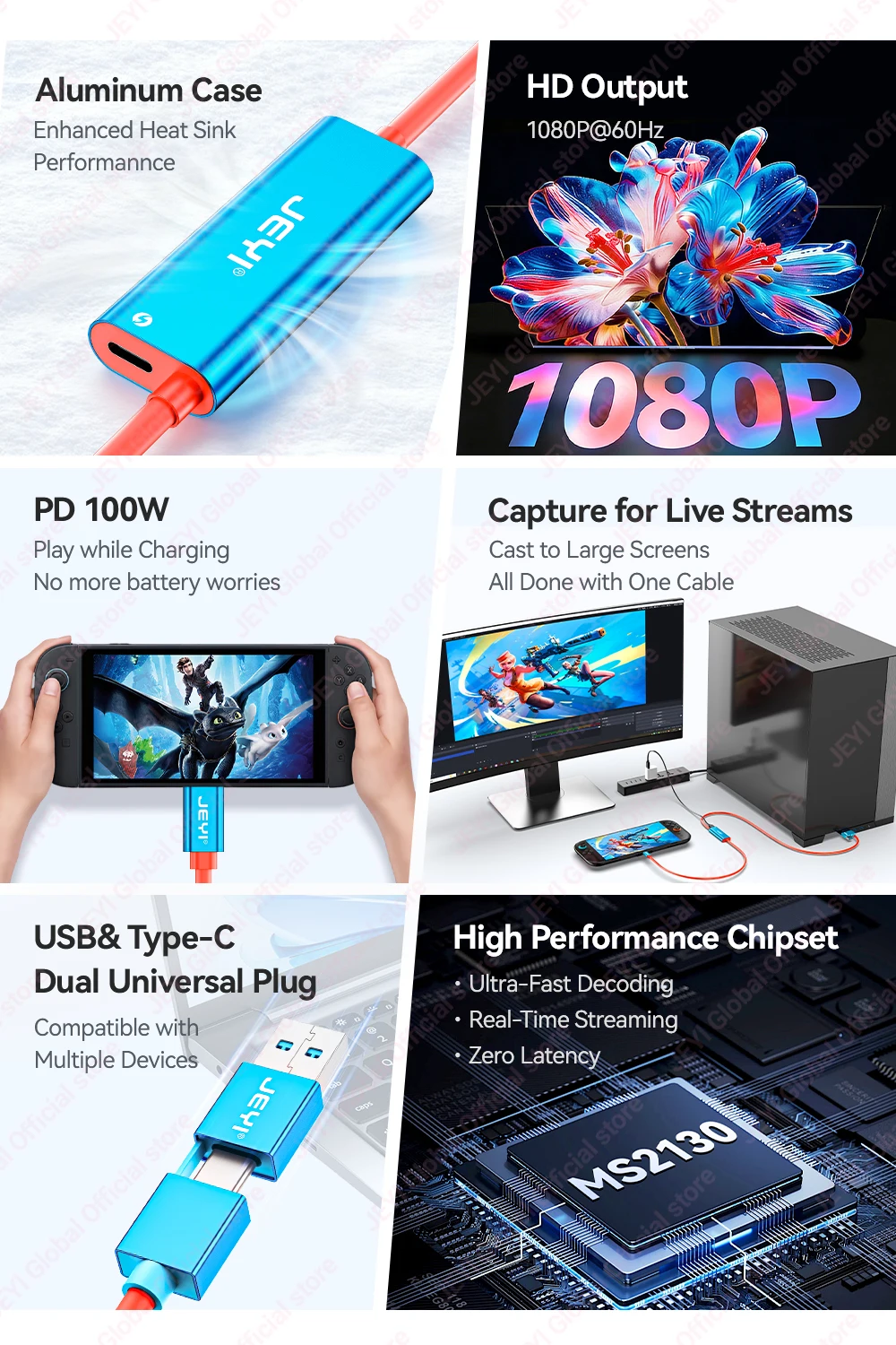 Tarjeta de captura de vídeo JEYI USB 3.0 Gen1 con 100W PD USB C a USB A/USB C en vivo y grabación de videojuegos de audio para Switch 2/1/OLED Quest 2/3 ROG portátil