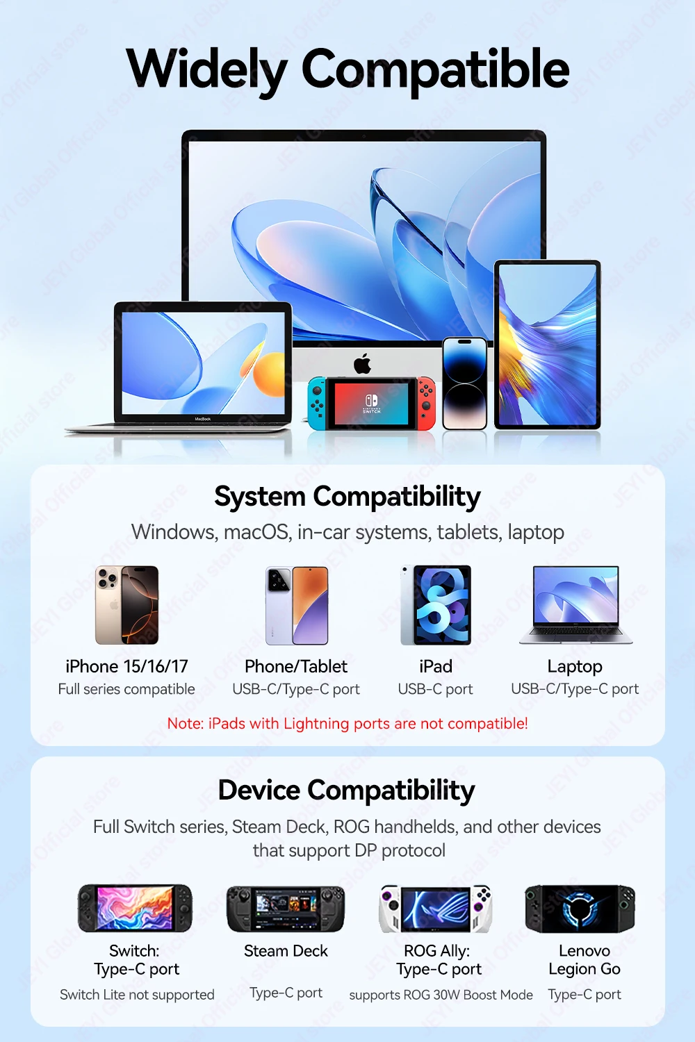 Teléfonos/tabletas/computadoras que admiten el protocolo de vídeo DP.(por ejemplo.: ROG, Steam Deck, iPad Pro, etc.)