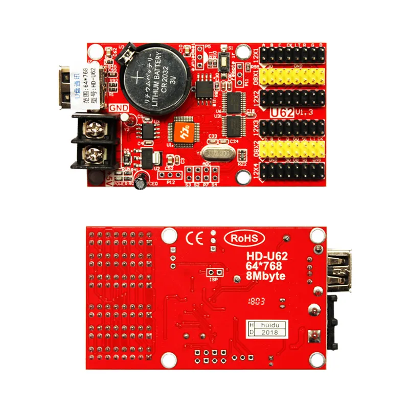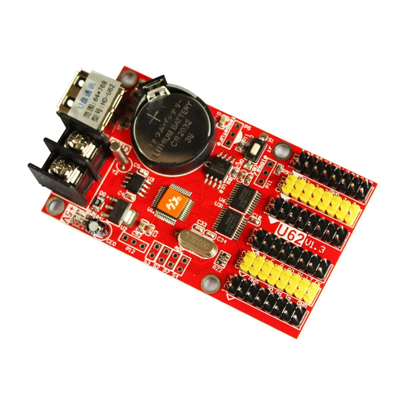 HD-U62 (conocido como U62) es una tarjeta de control de pantalla LED monocromática con comunicación de interfaz USB, programas actualizados y parámetros de depuración a través de U-Disk.Puede mostrar texto, reloj y cronometraje, calendario lunar, etc.El software de soporte tiene una interfaz simple, fácil de operar y, al mismo tiempo, se caracteriza por un rendimiento de alto costo.