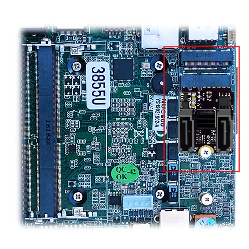 5. Se pueden transferir dos puertos SATA a través de la ranura M. 2 (A E Key) del host de la PC, y el usuario puede conectar dos unidades de estado sólido SSD o discos duros mecánicos con puertos SATA al mismo tiempo a través del cable de datos SATA..