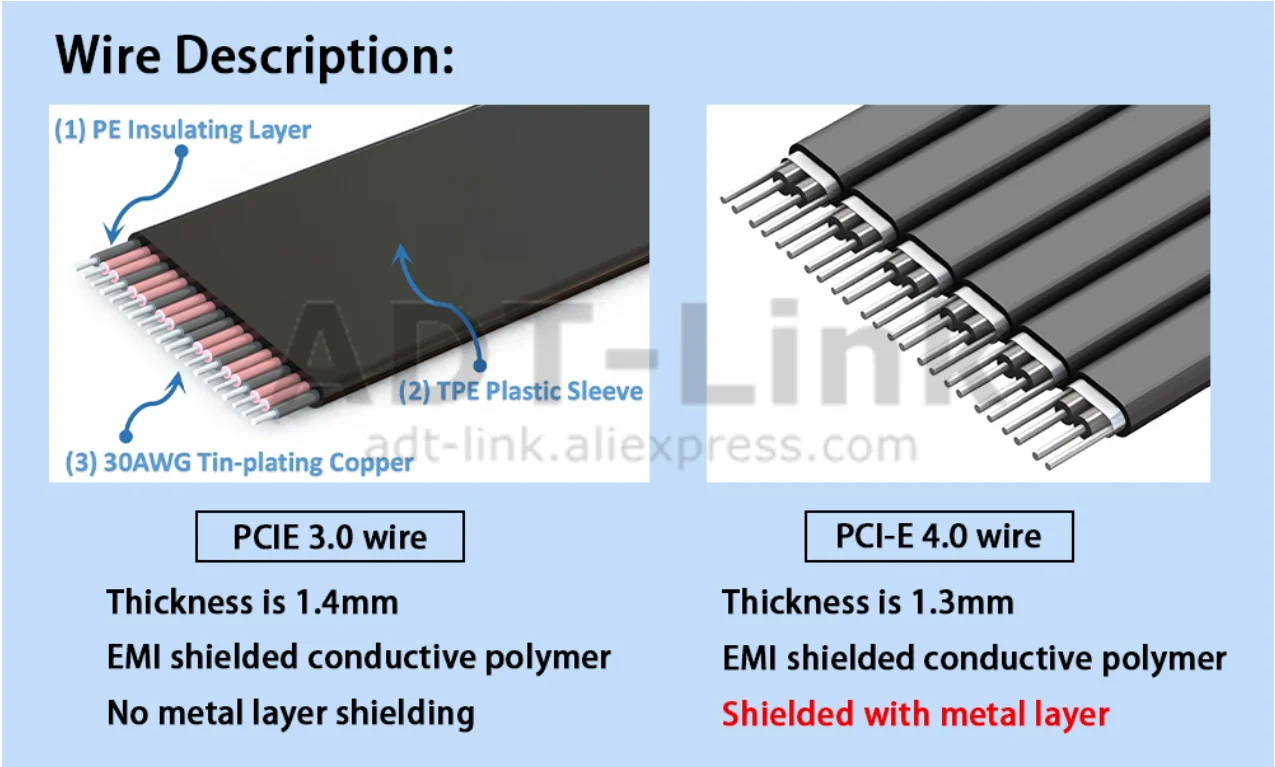 2) Is the wire soft? Can it be bent?The cable is the fourth-generation PCIe dedicated cable developed and designed by ADT. The black cable has a thickness of 1.3mm, the silver cable has a thickness of 1.4mm, and the blue cable has a thickness of 0.85mm. The cable can be bent or folded without affecting the use.