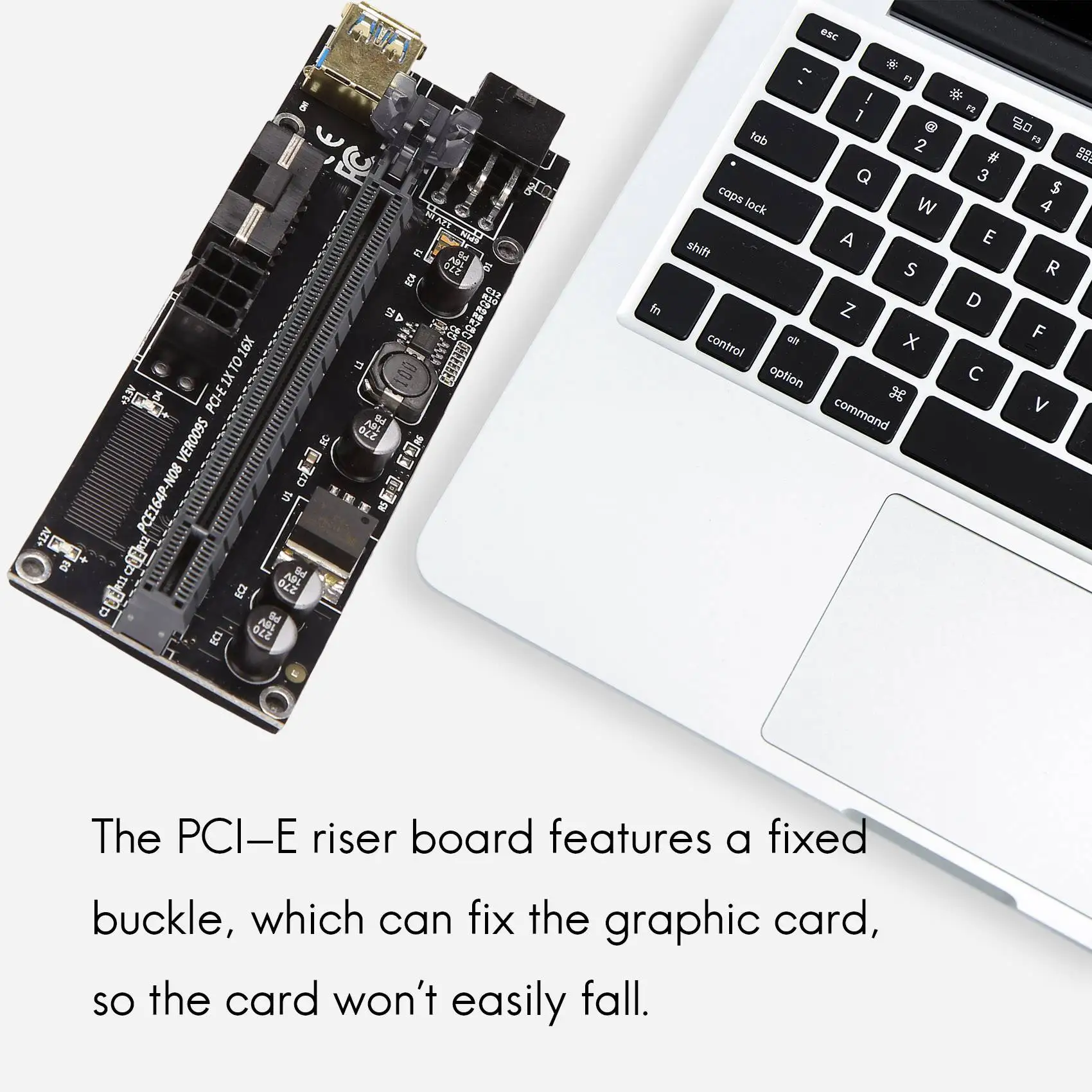 Este extensor de GPU PCI-E cuenta con contactos chapados en oro y tiene un buen rendimiento, se puede utilizar durante mucho tiempo. Hay 4 condensadores en esta placa PCI-E 1X a 16X para que la fuente de alimentación sea estable y segura. El adaptador PCI-E GPU presenta una resistencia estable y tiene 3 luces LED para mostrar los estados de trabajo. La tarjeta elevadora extensora GPU tiene una interfaz de 6 pines, puede conectarse fácilmente y la interfaz de 6 pines también puede reducir la carga de la placa base. La placa elevadora PCI-E cuenta con una hebilla fija, que puede fijar la tarjeta gráfica, por lo que la tarjeta no se caerá fácilmente. Nombre del producto: placa adaptadora de cable de extensión de tarjeta gráfica PCI-E X1 a X16 Rendimiento del producto: Interfaz de tarjeta gráfica de cable de extensión 6P (capacidad de fuente de alimentación 16A) para mejorar la interfaz de fuente de alimentación: PCI-E, USB3.0, 2*6 pines, 4 pines Longitud del producto: cable USB: 60cm/24 pulgadas Soporte del sistema: Linux/XP/win7, 8, 10 Color: Negro Material: PCB + metal Tamaño: 122x45mm Contenido del paquete: 1 * Placas adaptadoras PCI-E 16X 1 * Tarjetas elevadoras PCI-E 1X 1 * Cables USB 1 * Cables de alimentación de 6 pines a SATA Solo el contenido del paquete anterior, otros productos no están incluidos. Nota: La luz y las diferentes pantallas pueden hacer que el color del artículo en la imagen sea un poco diferente del real. El error de medición permitido es +/- 1-3cm.