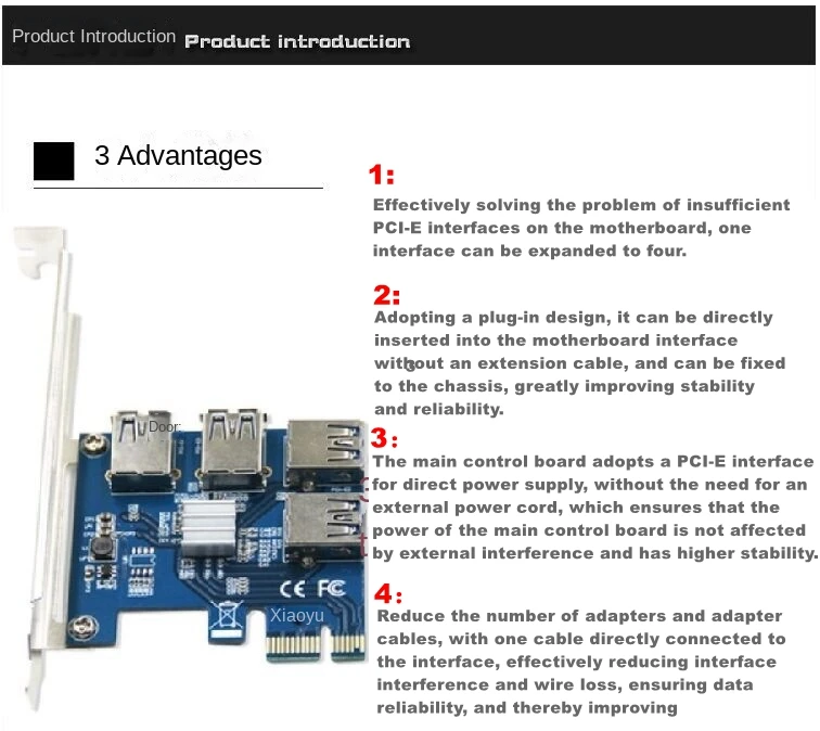 Interfaz de bus: PCIEX1 (compatible con X4 X8 X16) Número de interfaces: PCIE a 4 USB 3,0 Tamaño del producto: 120mm (deflector) * 67mm * 57mm Peso del producto: 70g Soporte del sistema: DOS, Linux, Win XP, WIN7, WIN8, WIN10 (etc.)