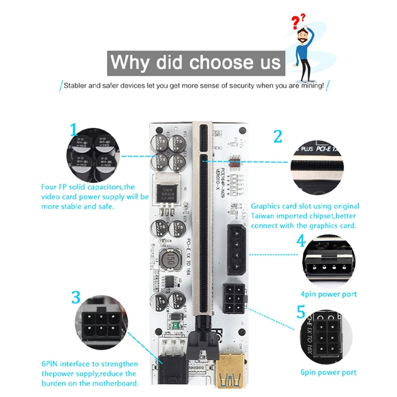 4.El conector PCI-E utiliza cables blindados multicapa, que se pueden conectar al máximo sin atenuar la señal.El cable USB es suave y estable, fácil de enrutar y la tarjeta gráfica se puede colocar a voluntad.