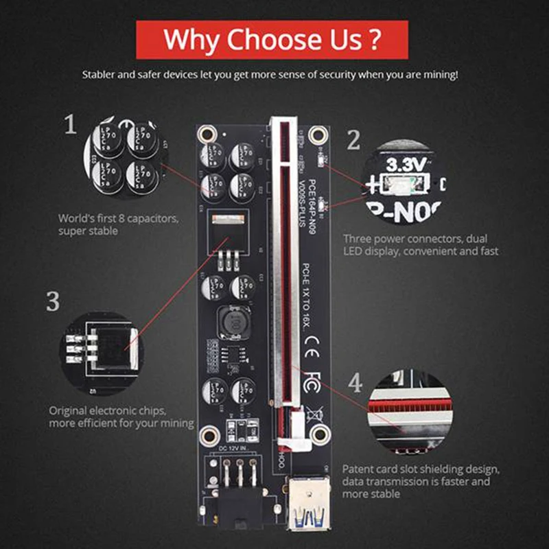 [Otras características]:No se necesita controlador; Con clip lateral para sujetar otra tarjeta; Dedicado para minería; Indicador DE TRABAJO DE 3,3 V + indicador de potencia de 12V. Sistema de soporte: compatible con todos los sistemas WINDOWS, LINUX, MAC.