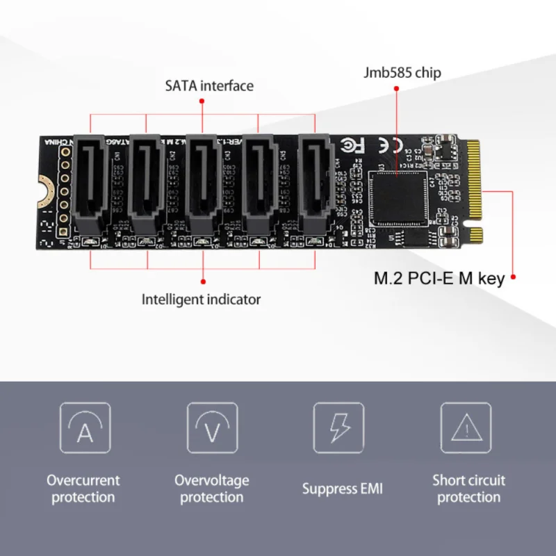 Tarjeta de expansión de chip JMB585 para M.2 MKey PCIe NVMe SSD a 5 puertos SATA III 6 Gb/s - Accesorios de tarjeta adaptadora
