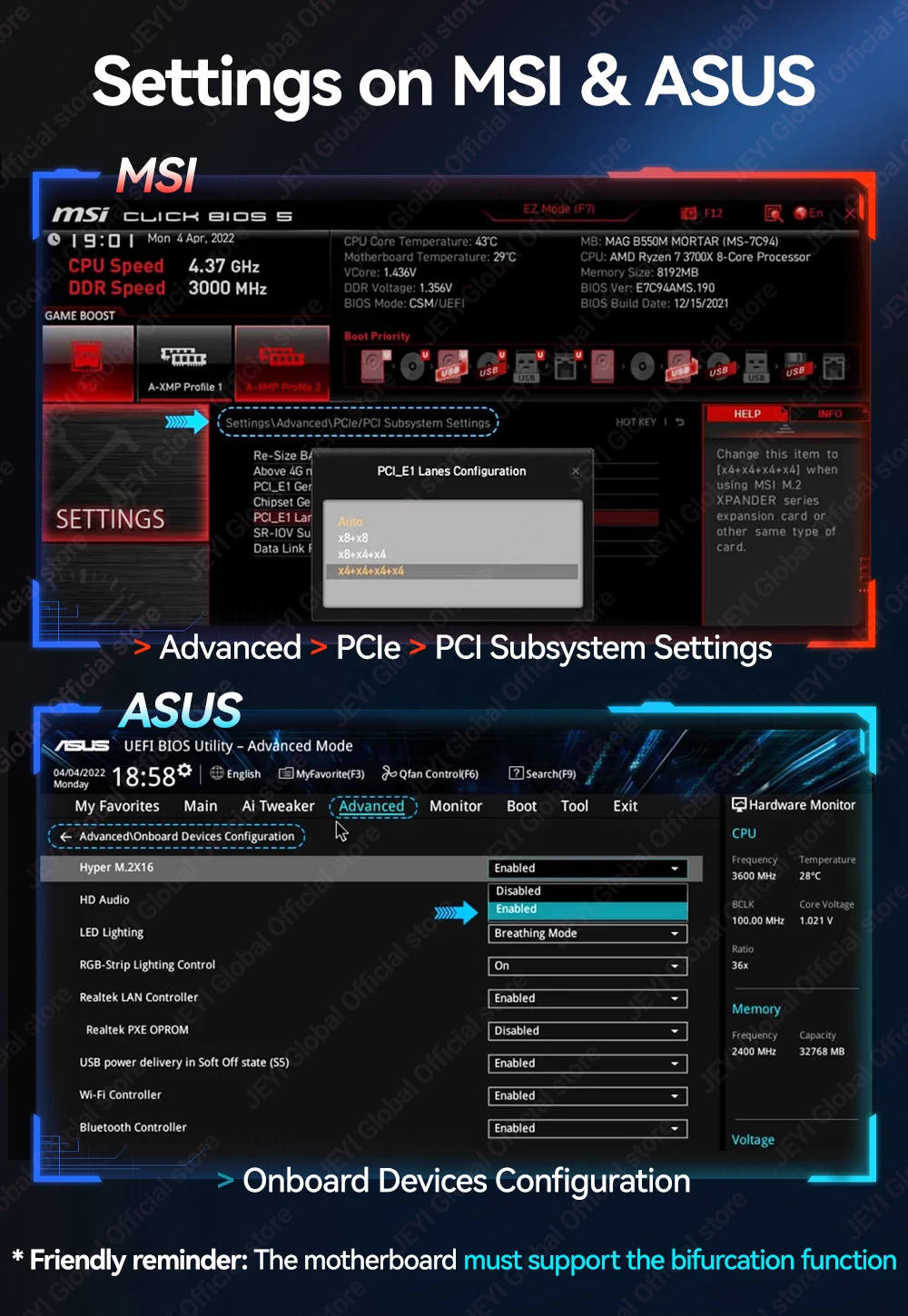 La placa base debe admitir bifurcación PCIe (división): este es un requisito previo para el uso de este producto.Si su placa base no admite esta función o si las carriles están configurados en Auto, solo se reconocerá un SSD.