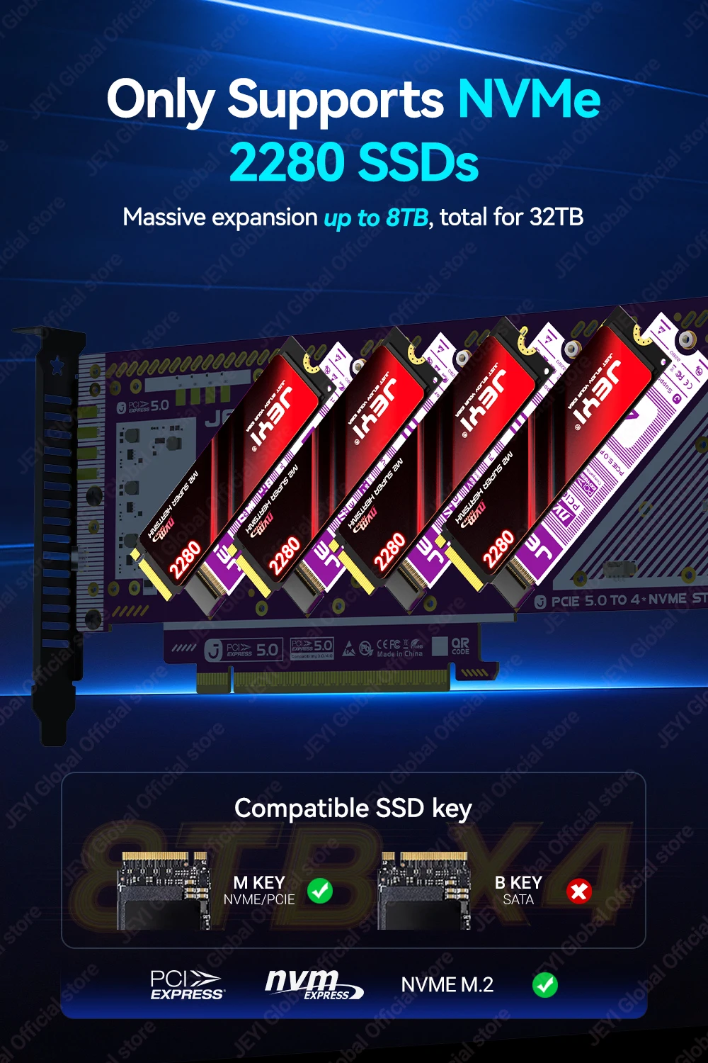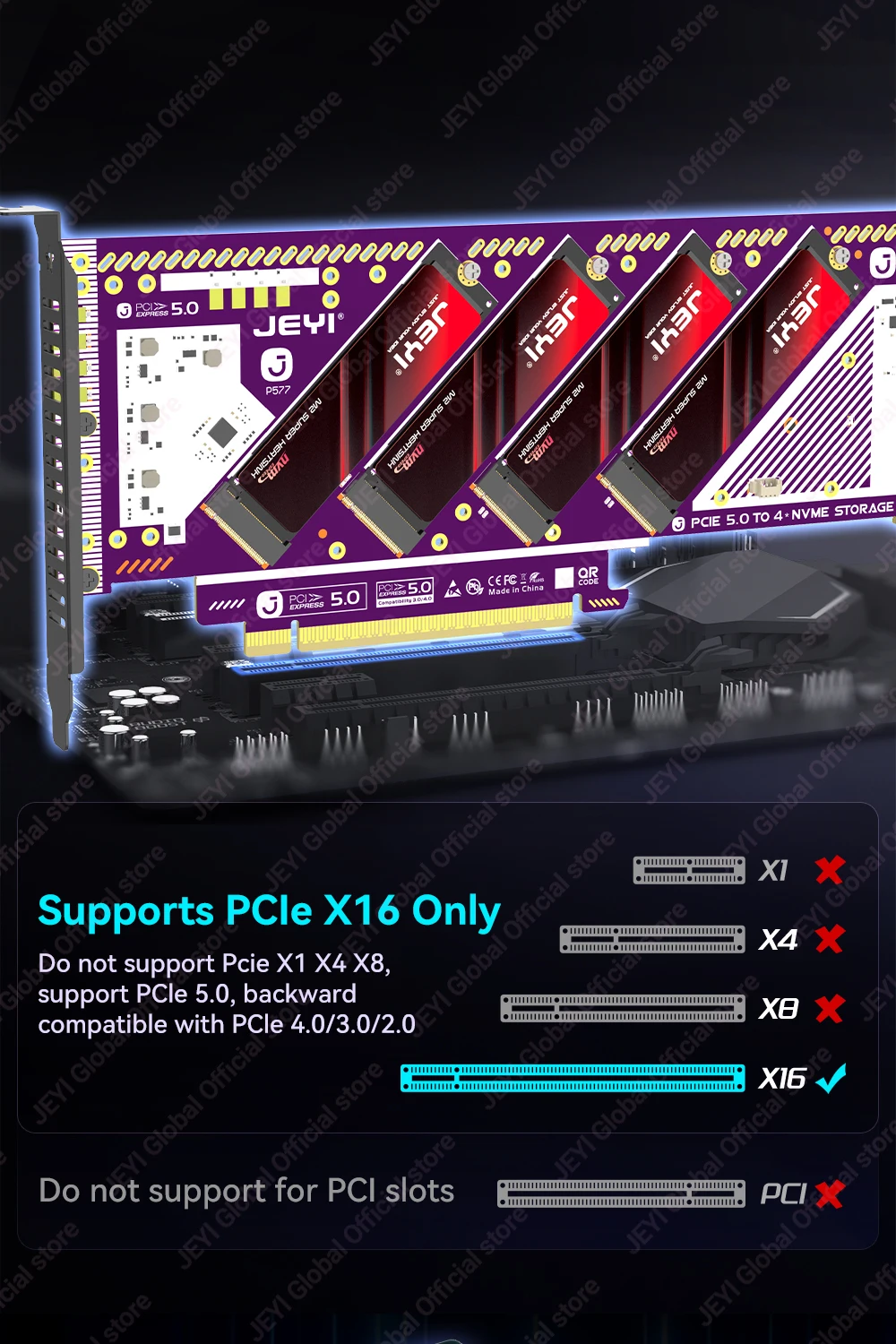 Tarjeta de expansión JEYI PCIe 5.0 X16 Quad M.2-4bay NVMe RAID 0/1/5/JBOD 512 Gb/s velocidad compatible con hasta 8 TB por SSD compatible con PCIe 4.0/3.0