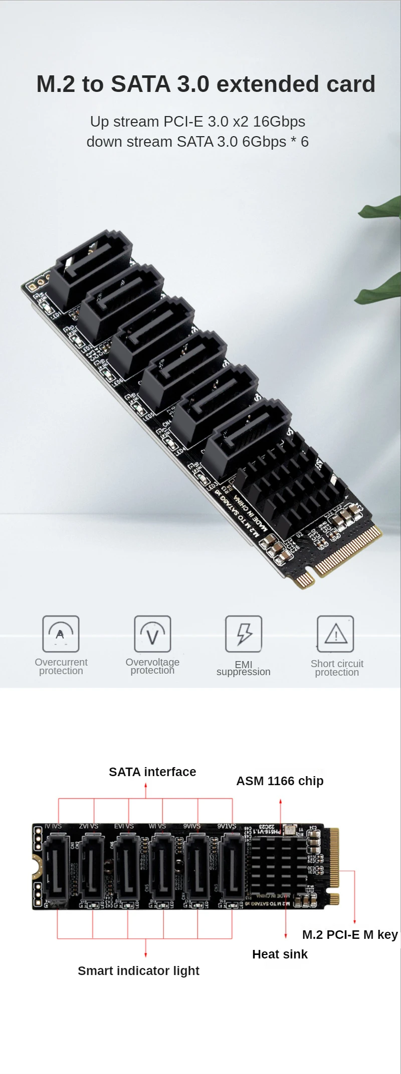 Comprar Tarjeta de expansión M.2 NVME m-key PCIE 3,0 a SATA 6Gbps, disco duro de sincronización NAS, adaptador PCI-E extendido, tarjeta elevadora ASM1166 PM
