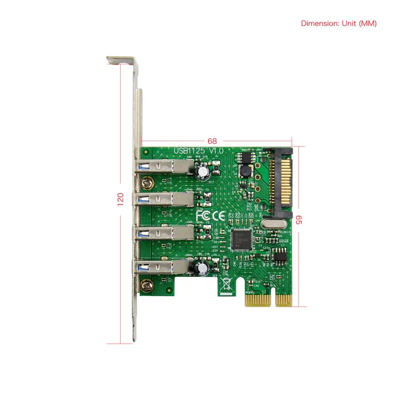 La tarjeta de expansión USB3.0 de 4 puertos admite chasis alto completo/chasis medio alto Diseño de protección de puerto de chip Maestro de alto rendimiento Cada interfaz del producto está equipada con un seguro de protección independiente. Cuando el dispositivo USB externo está en cortocircuito, la corriente es demasiado grande y la alimentación se puede apagar, para que el dispositivo y el ordenador no se dañen, la solución de problemas se responde automáticamente. Cada interfaz está equipada con un condensador regulador independiente para garantizar el suministro de energía de cada interfaz. Diseño de fuente de alimentación del producto Los productos vienen con un diseño de módulo de suministro sin fuente de alimentación externa. Al mismo tiempo, también está diseñada la interfaz de la fuente de alimentación SATA15PIN. Si necesita una mayor corriente para alimentar, ¡puede agregar SATA15PIN a la energía! ¡Interfaz USB3.0 4 Diseño de interfaz USB3.0 estándar!