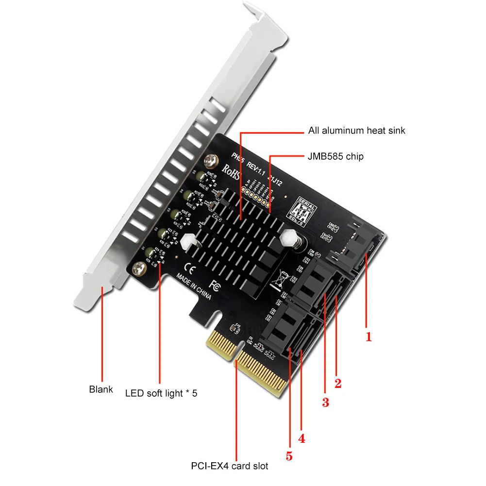 1.Transferencias y estabilidad de alta velocidad:Experimente transferencias de datos rápidas y estabilidad inquebrantable con nuestra tarjeta de expansión PCIe a SATA3.0 de 5 puertos.Aprovechando la potencia de la última solución de chip JMB585, satisface la necesidad de almacenamiento de datos sustancial, lo que permite transferencias de datos rápidas y un rendimiento estable.