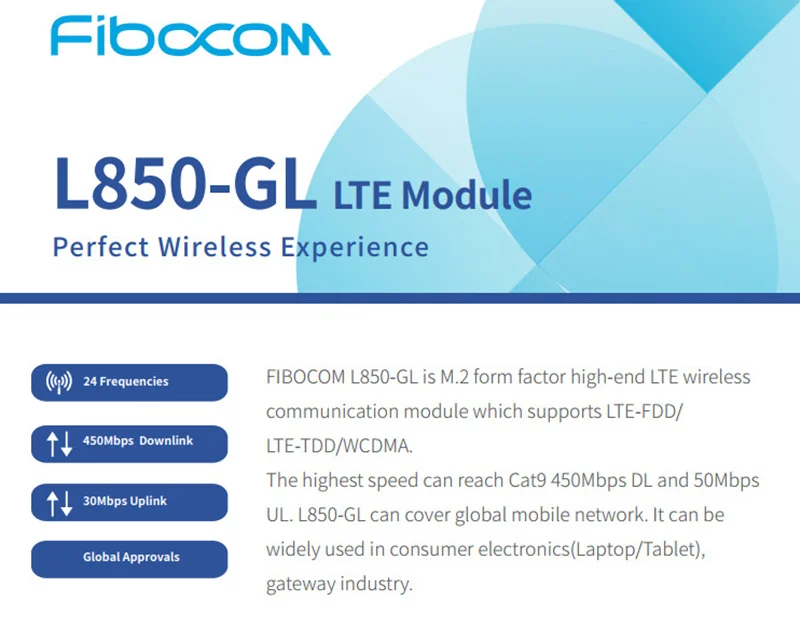 El es un módulo de memoria completa de alta velocidad LTE Cat9. Se basa en la plataforma Intel7360 y se basa en la interfaz M.2. El tamaño de la L850-GL es 30*42*2,3mm. Es compatible con LTE FDD, LTE TDD, WCDMA y muchos otros formatos. Se prefiere la aplicación de la computadora portátil, y se puede aplicar ampliamente en campos como pasarelas, monitoreo industrial y telemedicina. El Fibocom L850 tiene una velocidad de enlace descendente de 450Mbps, admite MIMO 2*2, admite la combinación 3CA y la combinación 2CA. Admite eSIM al mismo tiempo, puede satisfacer la rápida demanda comercial de los usuarios.