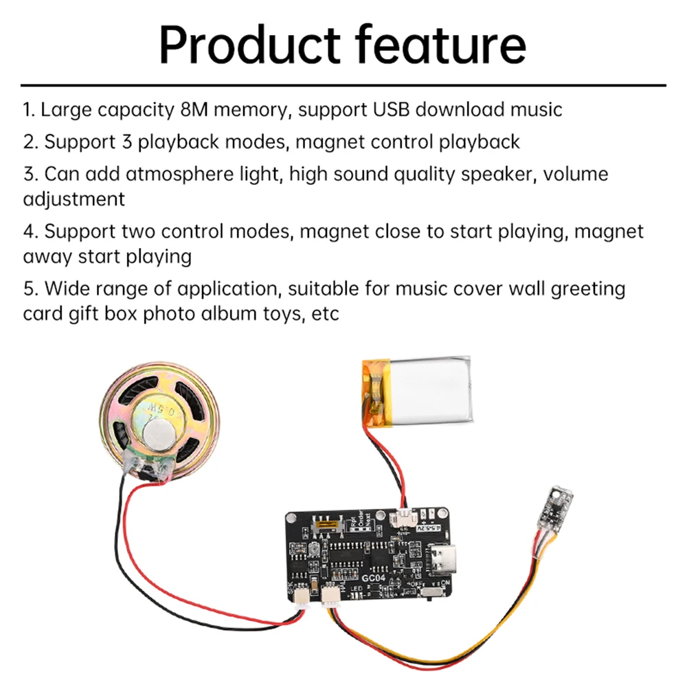 1.Reproducción en bucle: cuando sale el imán, comience a reproducir la música almacenada y continúe haciendo bucle a través de toda la música; Deje de reproducir inmediatamente cuando el imán se acerque durante la reproducción.