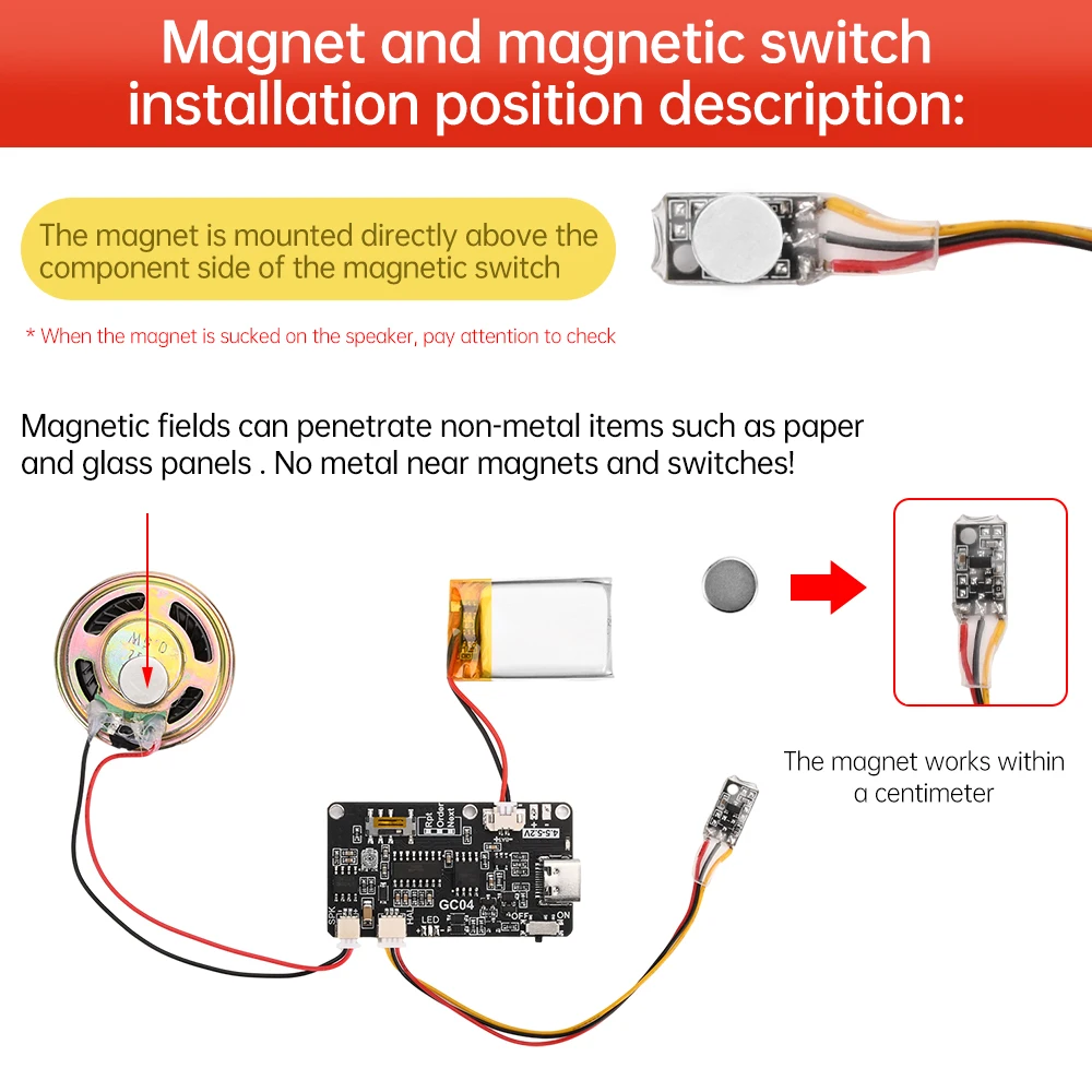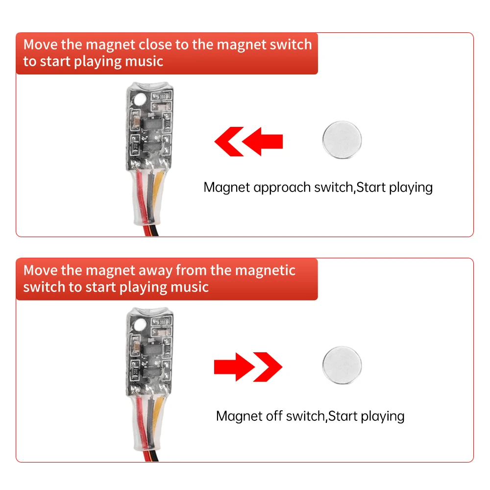 2.Reproducción sin bucle: cuando el imán se acerca, la música almacenada comienza a reproducirse y se detiene después de reproducirlo una vez; Deje de reproducir inmediatamente cuando el imán sale durante la reproducción.