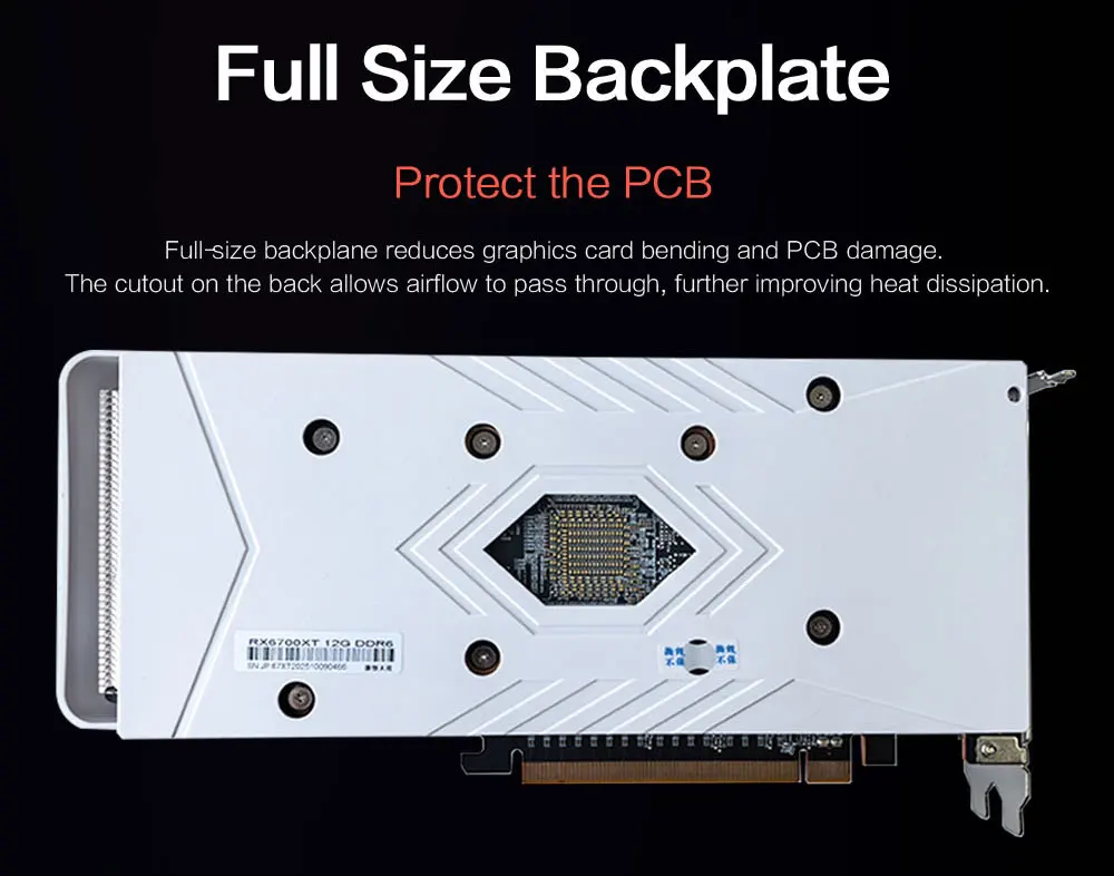 Proteja la PCB --- La placa posterior de tamaño completo reduce la flexión de la tarjeta gráfica y el daño de la PCB. El recorte en la parte posterior permite el paso del flujo de aire, además
