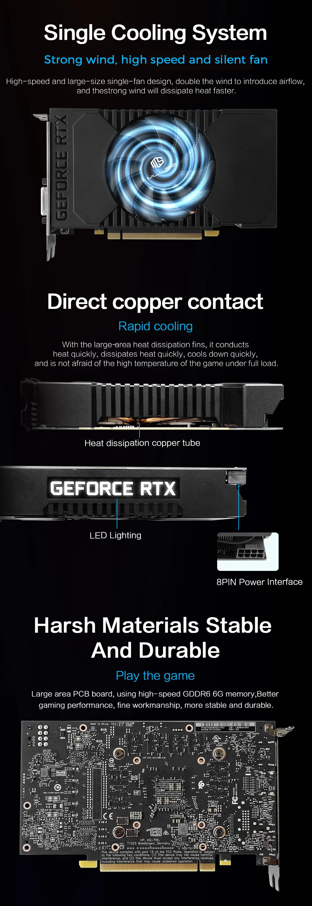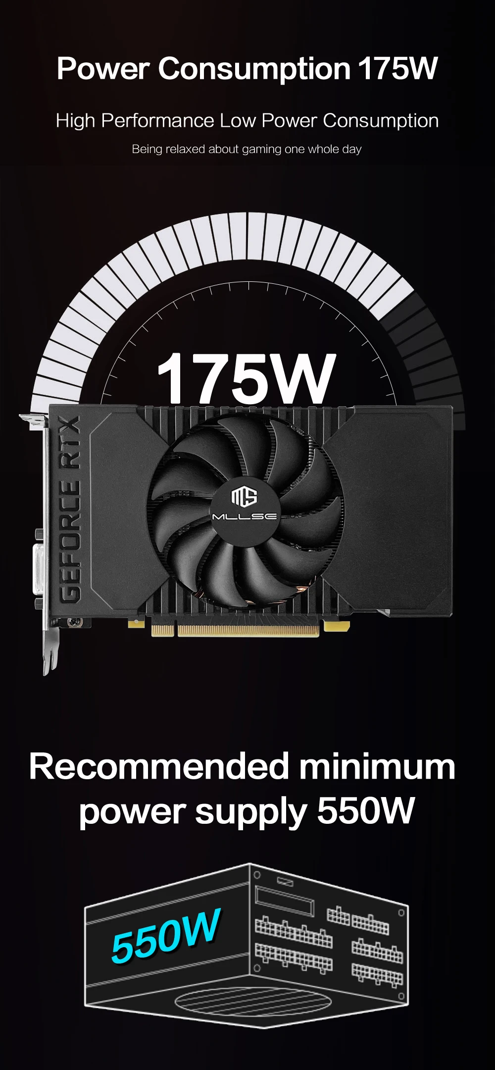 MLLSE GeForce RTX 2060 SUPER Видеокарта obtiene energía de 1 conector de alimentación de 8 pines, con un consumo de energía nominal de 175 W máximo.