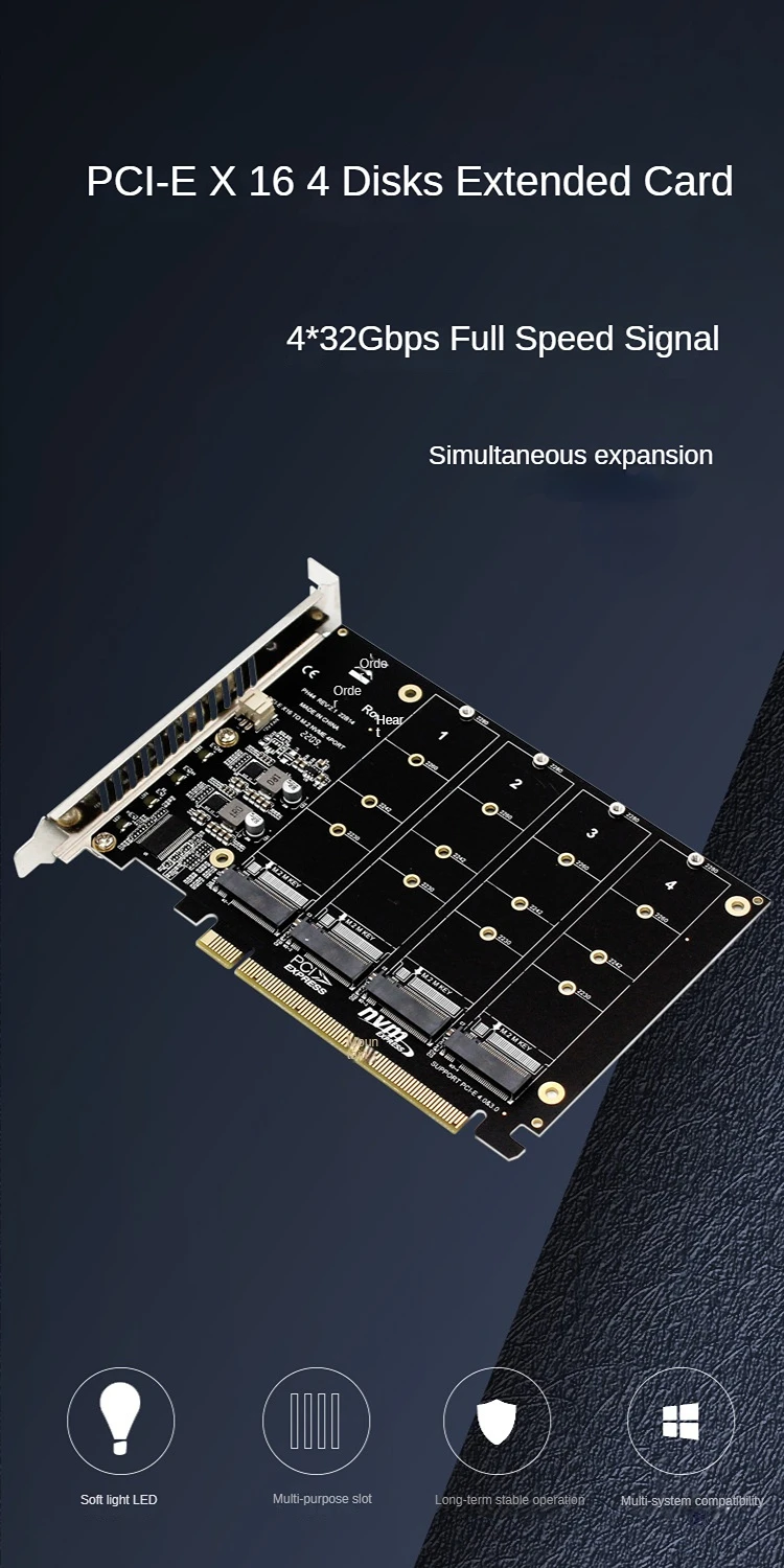 PCI-E X16 4-disk expansion card with 4* 32Gbps full-speed signal and simultaneous expansion.