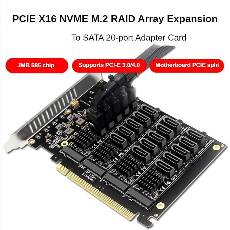 Comprar Tarjeta de matriz dividida de señal PCI-E X16, tarjeta de expansión Raid de 4 discos M.2 NVME, PCIe 16x a SATA, tarjeta adaptadora extendida de 20 puertos, Chip JMB585