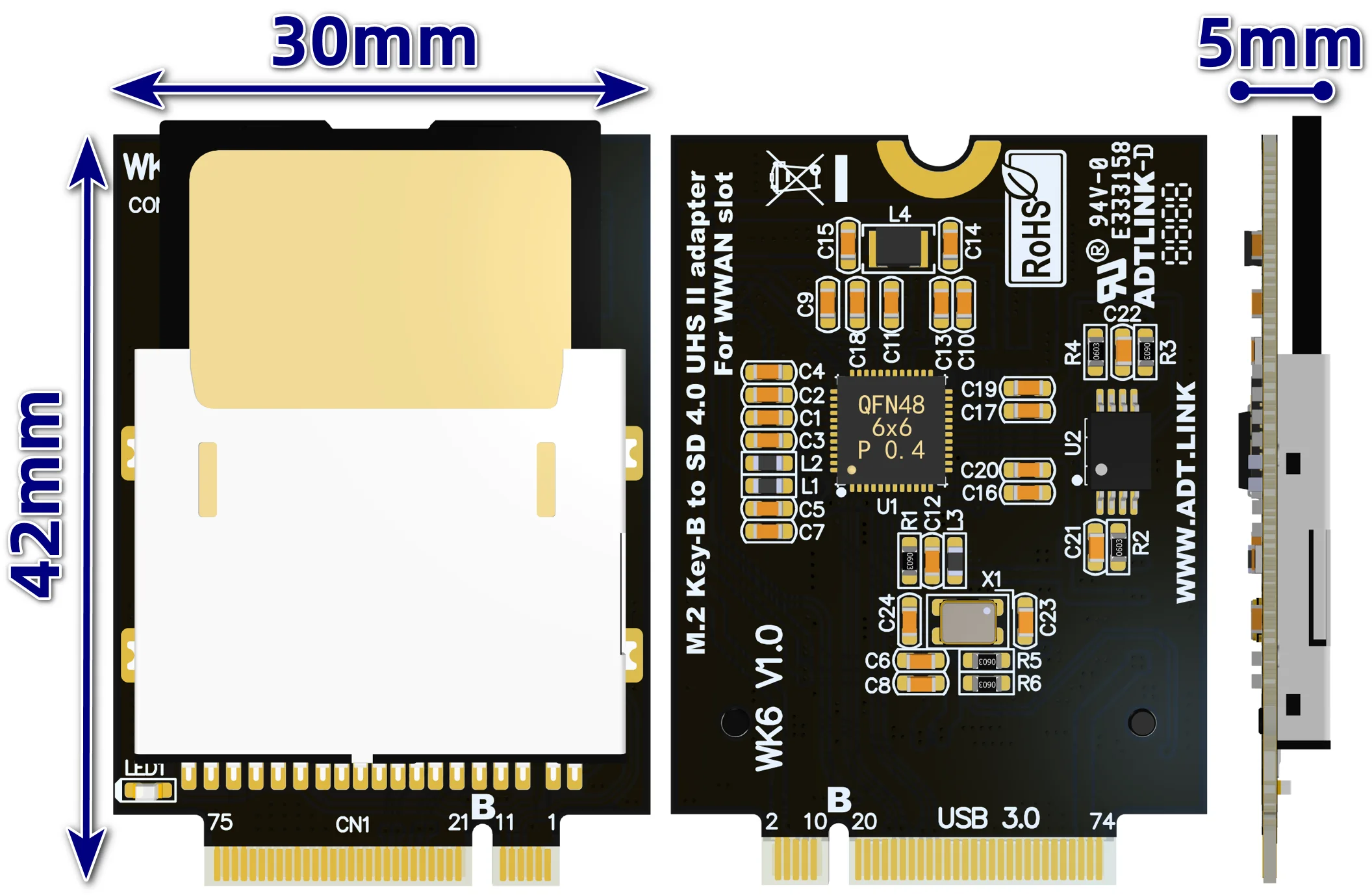 Especificaciones de la placa de conmutación: Puerto M.2 B-key WWAN. El tamaño es 30x42mm. La Placa de conmutación es compatible con SD 4,0/