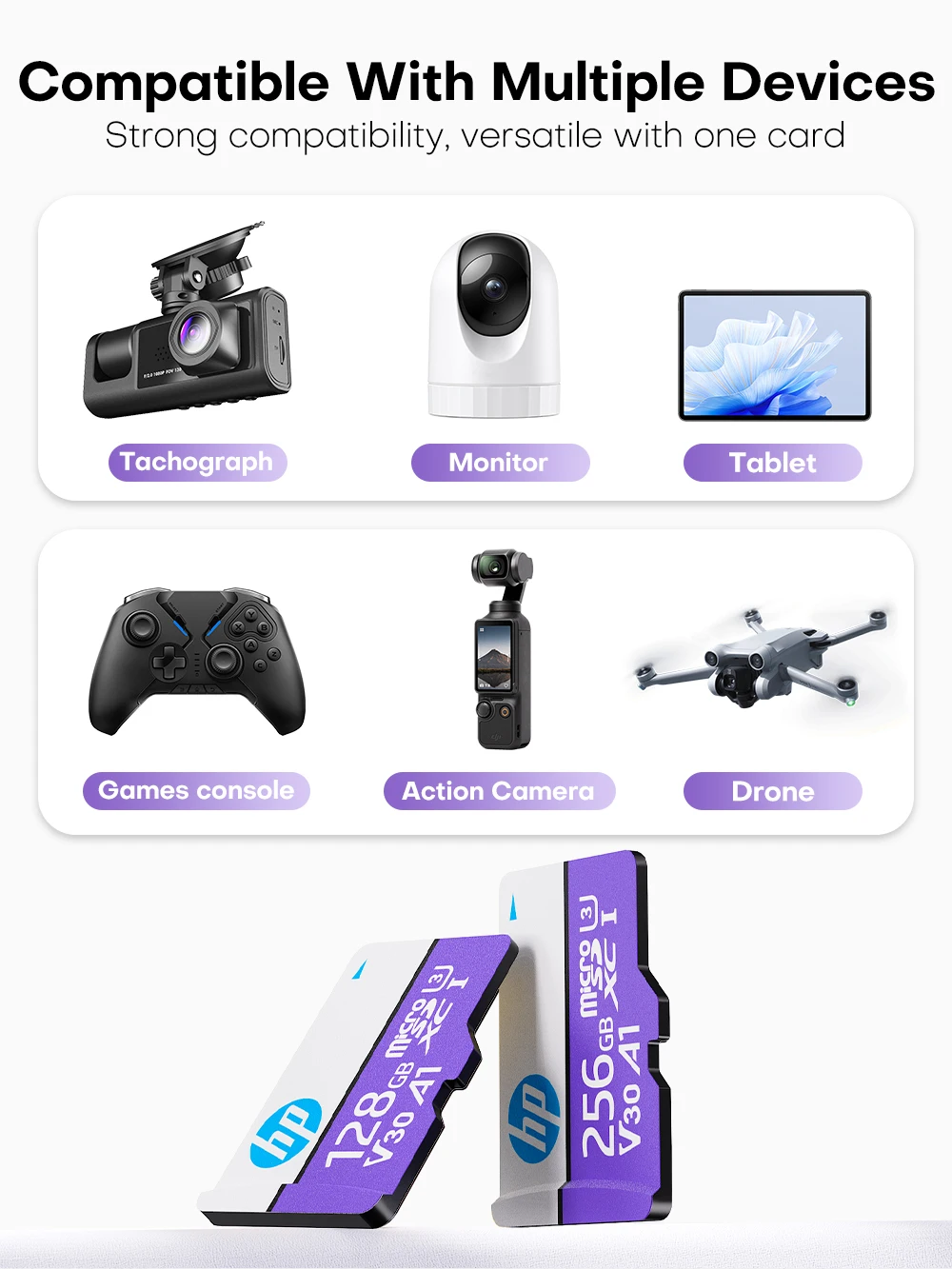 1. Amplia compatibilidad: Compatible con teléfonos inteligentes, tabletas, GoPro/cámaras de acción, computadoras portátiles, computadoras de escritorioSLR, drones, Nintendo Switch/otras consolas portátiles, etc.