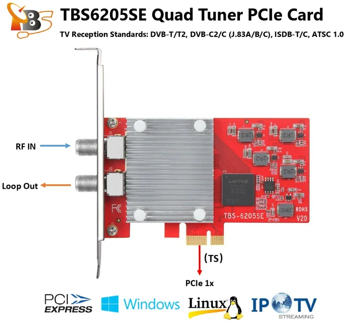 TBS6205se DVB-T2/C2/T/C(J.83A/B/C)/ISDB-T/C /ATSC1.0.La tarjeta sintonizadora TV Quad también funciona comograbadora de vídeo digitalpara grabar programas de televisión digital terrestre con soporte completo de HDTV.TBS6205se se considera un sintonizador de TV profesional para usuarios de nivel industrial.Cuando las ranuras PCIe del servidor son limitadas, TBS6205se le permite recibir más canales que el sintonizador dual habitual.Por lo tanto, es muy recomendable paraTransmisión de IPTVysistema de transmisión.