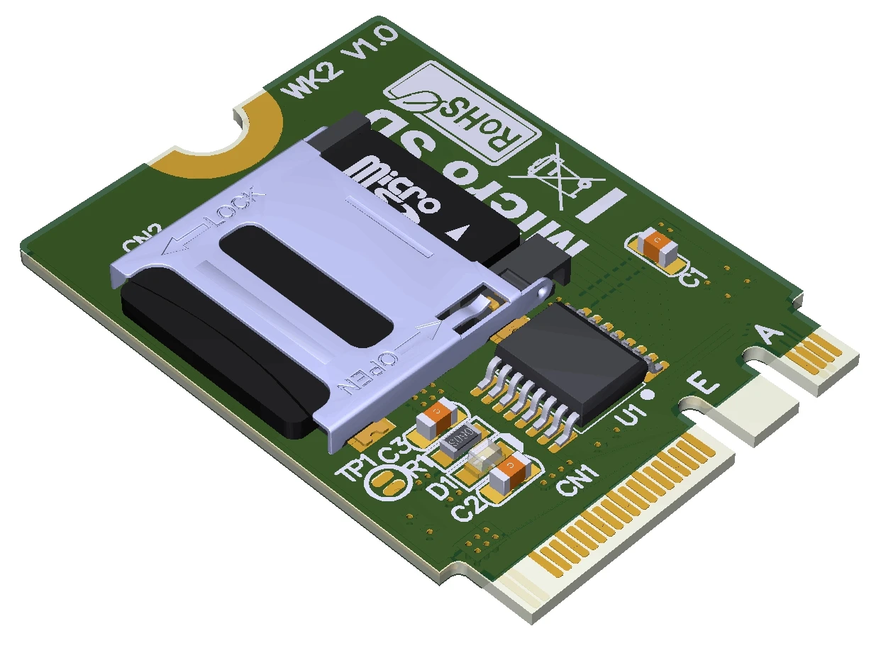 Llave M.2 NGFF A.E (2230) 22mm x 30mmCARACTERÍSTICASCumplimiento de especificaciones USB-Cumple con la especificación de Bus serie universal de 480Mbps Rev. 2,0-Cumple con la especificación de clase de almacenamiento USB Rev. 1,0-Admite una dirección de dispositivo y hasta cuatro puntos finales: Control (0)/lectura masiva (1)/Escritura masiva (2)/interrupción (3)Bloques de construcción USB integrados-Macro transceptor USB2.0 (UTM), motor de interfaz en serie (SIE), reinicio de encendido integrado (POR) y detector de bajo voltaje (LVD)Secure DigitalTM (SD) y MultiMediaCardTM (MMC)-Compatible con la especificación SD v1.0 / v1.1 / v2.0 / SDHC (hasta 32GB)-Compatible con SDXC (hasta 2TB)-Admite bus de datos de 1/4 bitsAdmite modo Boost para SD3.0 para un mejor rendimientoAdmite función LED para indicar el estado de alimentación y accesoRequisitos del sistemaUn enchufe A.E. con llave M.2 gratis (ranura WiFi)